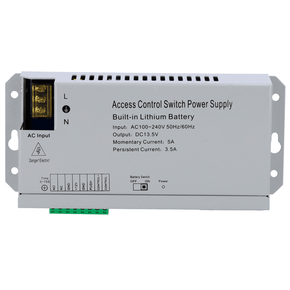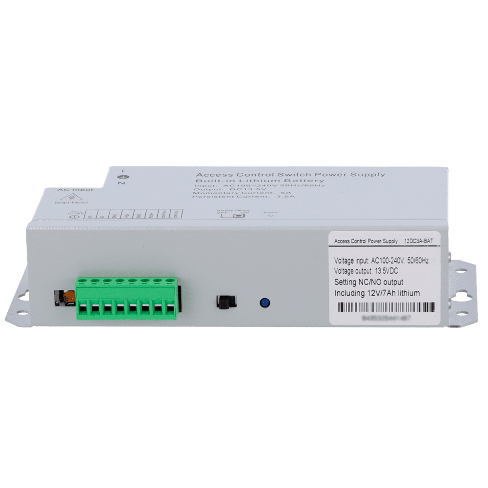 Alimentador para controlo de acesso – Configurável NA/NF – Saída CC 13.5V / 3.5A – Sem caixa – Bateria de lítio de reserva 12V / 7Ah incluída – Montagem na superfície