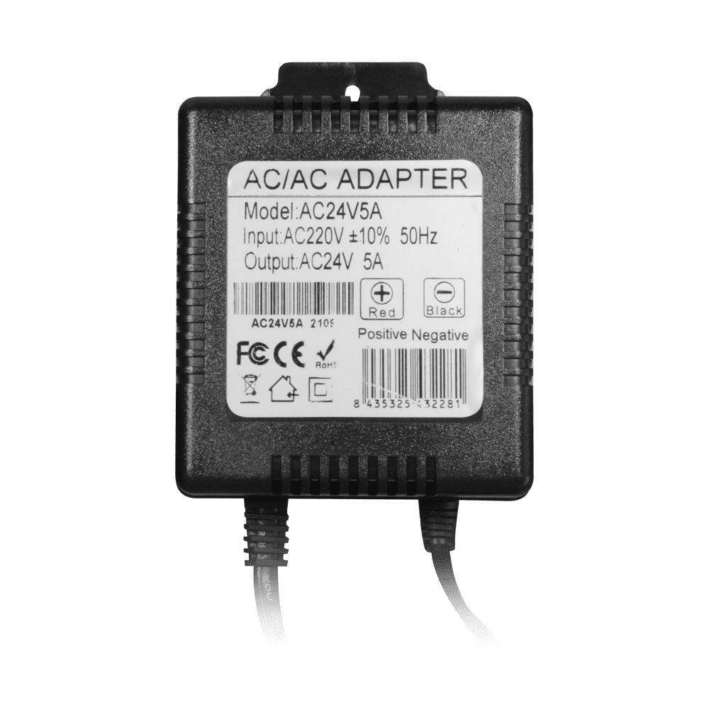 Transformador AC/AC – Entrada AC 230 V – Saída AC 24 V 5 A – Comprimento de cabos 1 m – 102 (Al) x 120 (Lg) x 80 (Fd) mm – 1870 g