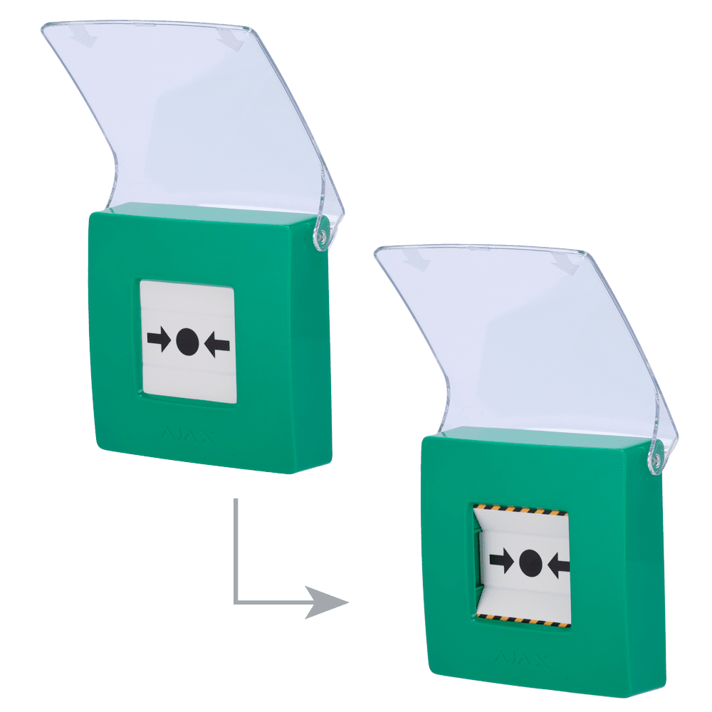 Botão verde de alarme manual de incêndio – Sem fios 868 MHz Jeweller – Botão de alarme de incêndio ou ativador de cenário – Compatível com a função de alarme interligado – Transmissão de alarme para o ARC (configurável) – Alimentação 2 pilhas CR123A