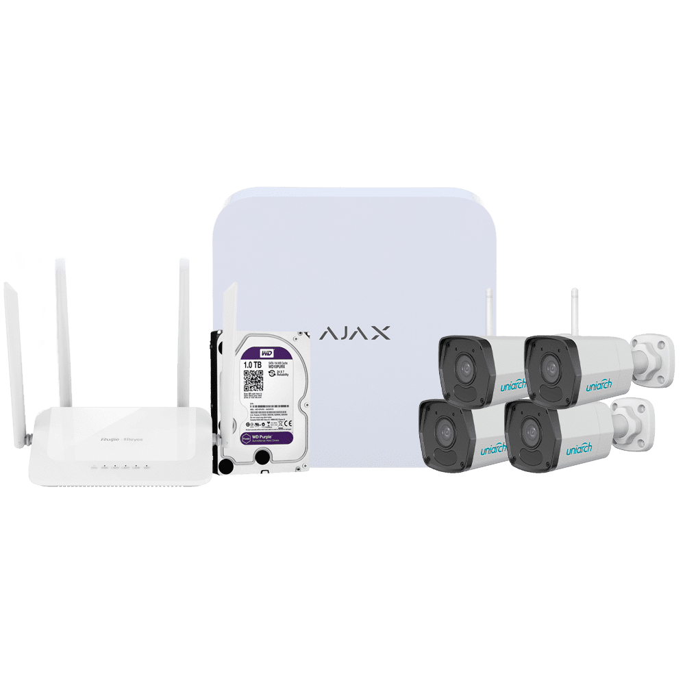 Kit de videovigilância Ajax – Gravador Ajax de 8 canais – 4 câmaras bullet WiFi de 2 Mpx Uniarch – Router WiFi de 4 portas – Um disco rígido de 1 TB – Integração ONVIF