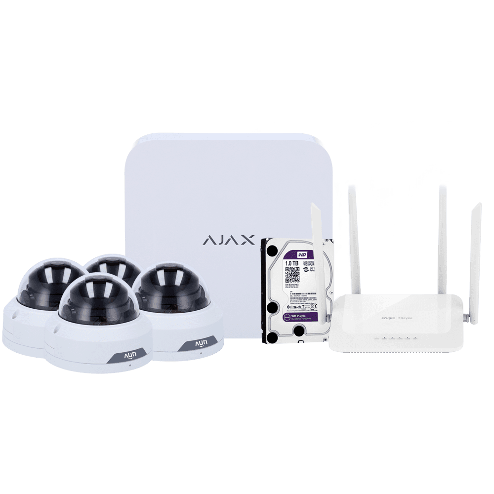 Kit de videovigilância Ajax – Gravador Ajax de 8 canais – 4 câmaras turret WiFi de 2 Mpx Uniview – Router WiFi de 4 portas – Um disco rígido de 1 TB – Integração ONVIF