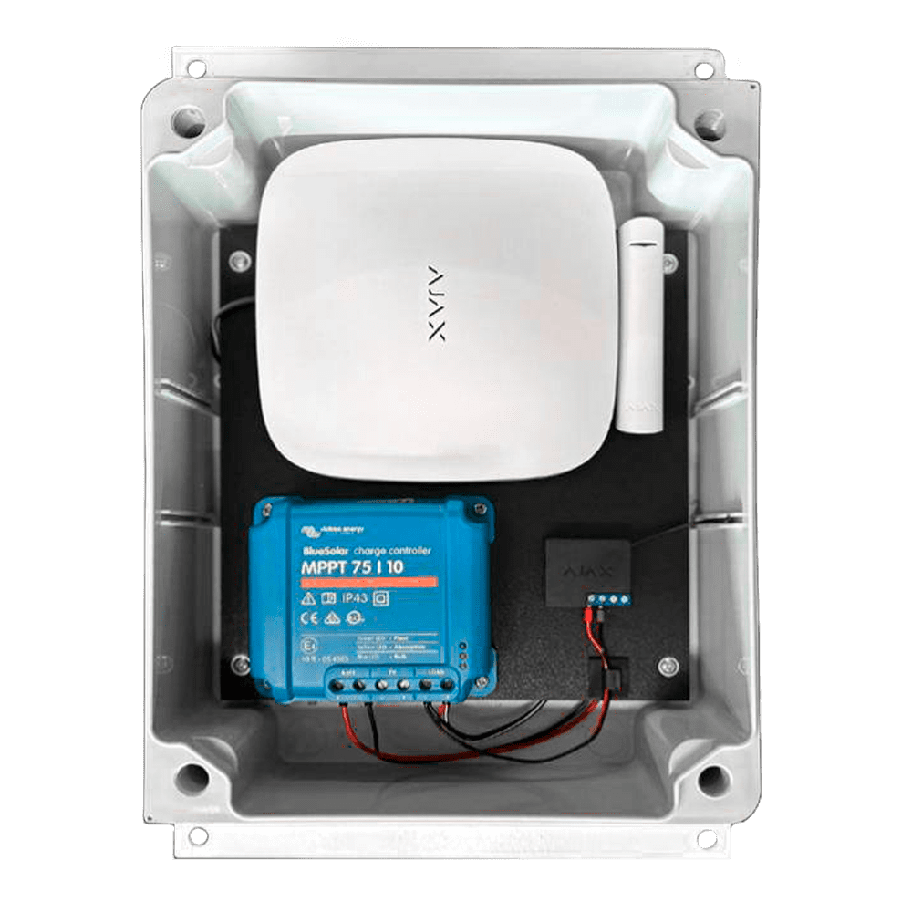| Dispositivos Ajax recomendados | Painel de controlo: 1 x AJ-HUB2-W/B ou AJ-HUB2-4G-W/B Módulo de alimentação: 1 x AJ-DC1224V-PCB2 PIRCam exterior: 4 x AJ-MOTIONCAMOUTDOOR-W ou AJ-MOTIONCAMOUTDOOR-PHOD-W Sirene exterior: 2 x AJ-STREETSIREN-W/B Detetor de inclinação e de impacto: 1 x AJ-DOORPROTECTPLUS-W/B ou AJ-DOORPROTECTPLUS-S-W/B (deteção de sabotagem) Relay: 1x AJ-RELAY (controlo da potência do painel solar) |