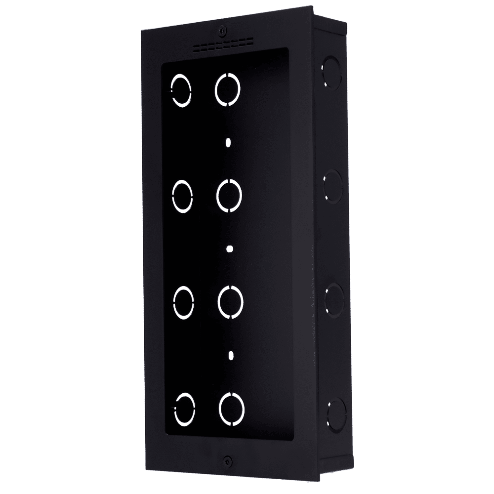 Painel frontal e caixa de registro encastrada – Específico do Akuvox AK-E16Cy AK-A05C – Painel: 230 (Al) x 120 (Lg) x 22 (Fd) mm – Caixa: 223 (Al) x 109 (Lg) x 40 (Fd) mm – Fabricado em alumínio e aço galvanizado