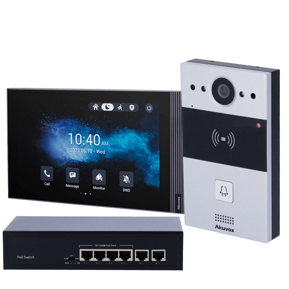 Kit de entrada de vídeo de superfície de porta Linux – IP | Placa e monitor – Áudio bidireccional Crystal Clear – Leitor EM/MF e NFC | PoE standard – 2 Saídas de relé | Resistente a vandalismo – Conexão através da cloud