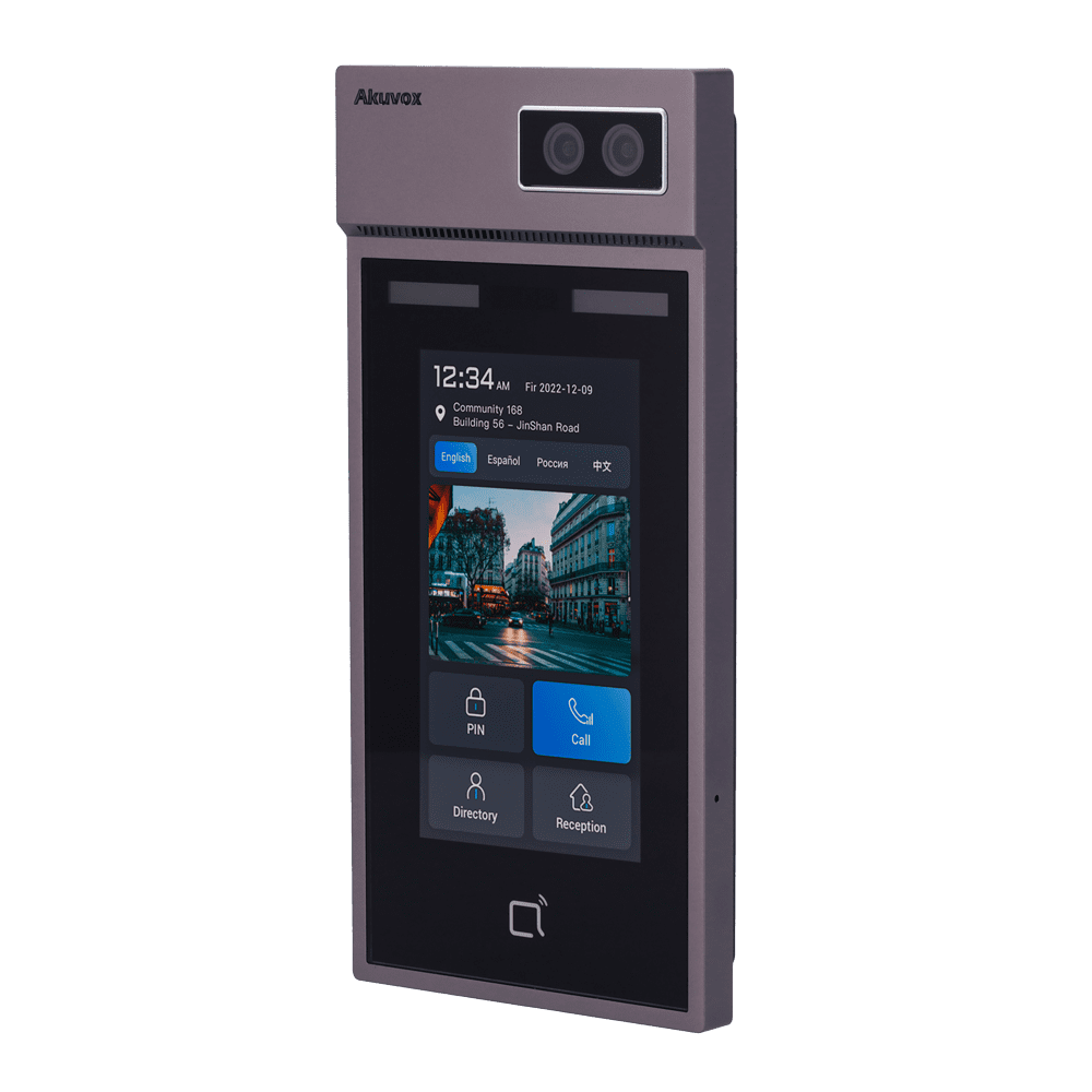 Videoporteiro IP anti-vandalismo IK08. – Câmara 2 Mpx/1 Mpx | Áudio bidirecional – Reconhecimento facial, cartão, NFC, PIN, BLE e QR | 1 relé – Apartamentos | PoE+, SIP padrão – Ecrã IPS 5″ táctil | Manutenção Cloud – Ligação via Cloud | Saída 12V