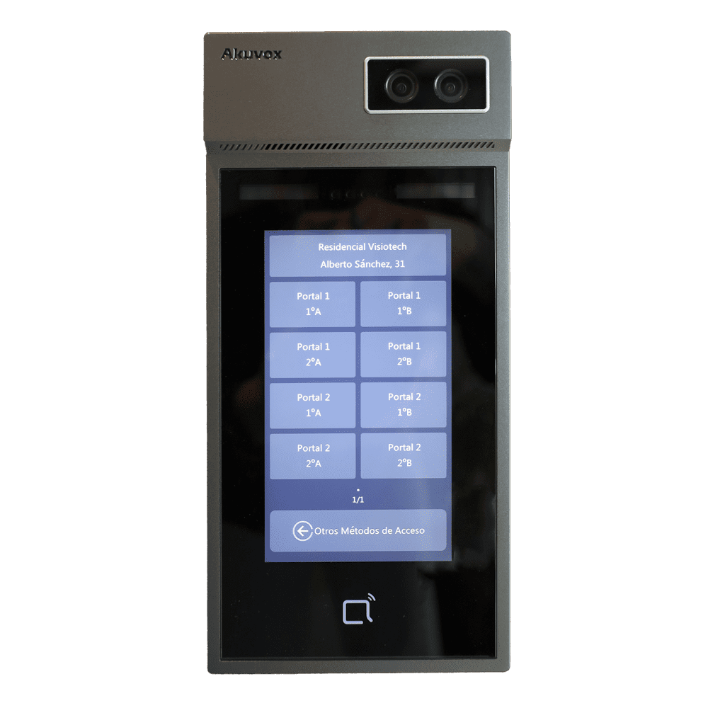 | Controlo de acesso | Abertura de porta com reconhecimento facial, cartão RFID EM 125 kHz e MF 13.56 MHz, NFC, BLE, QR e PIN, com registos |
