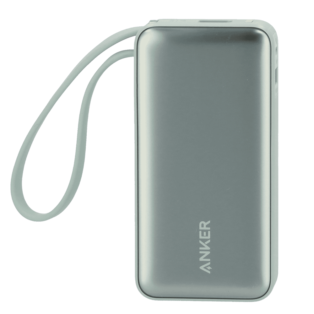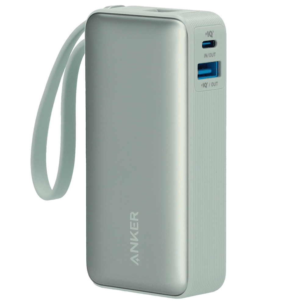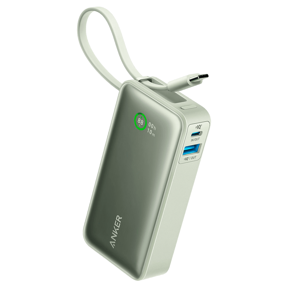 Anker Power Bank com ecrã LCD – Capacidade 10000mAh – 1x Entrada USB-C e cabo USB-C – Saídas USB-A, USB-C e cabo USB-C – Carregar dispositivos 3 de cada vez – Cor verde | Carregamento rápido 30W