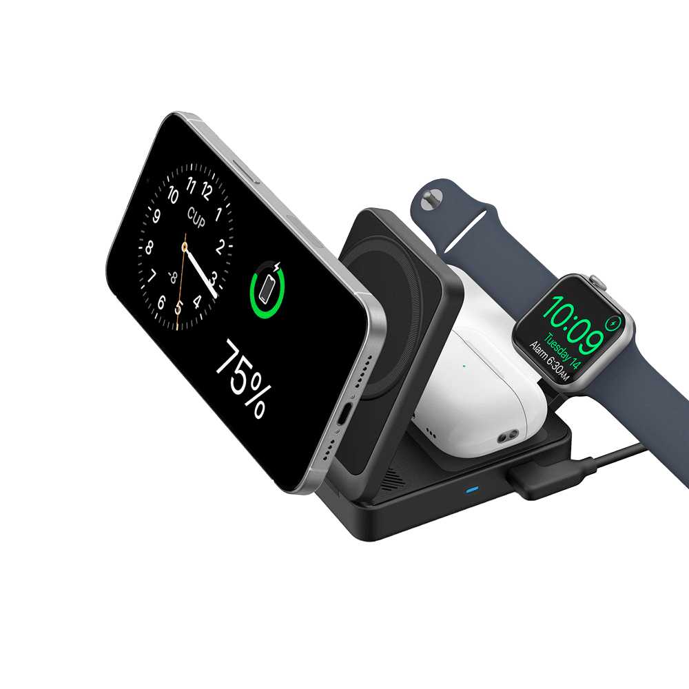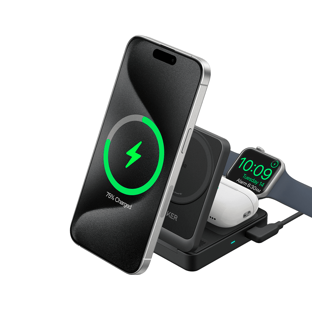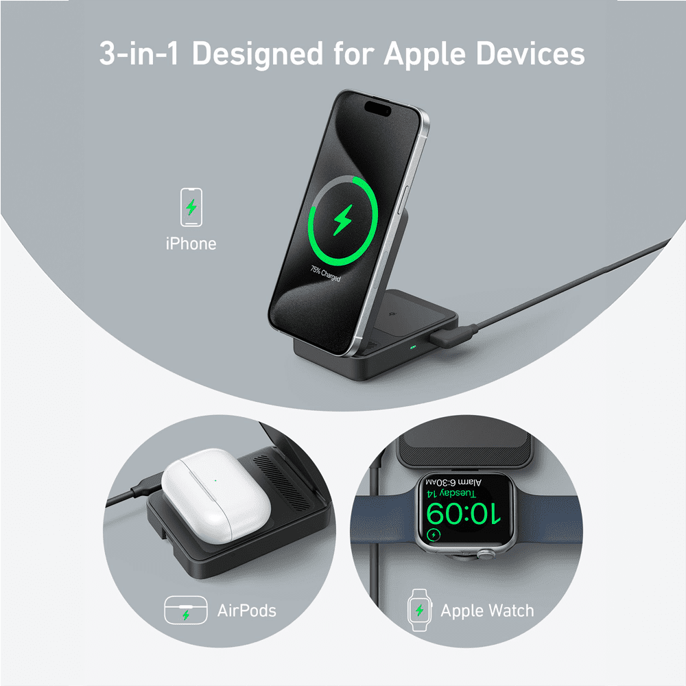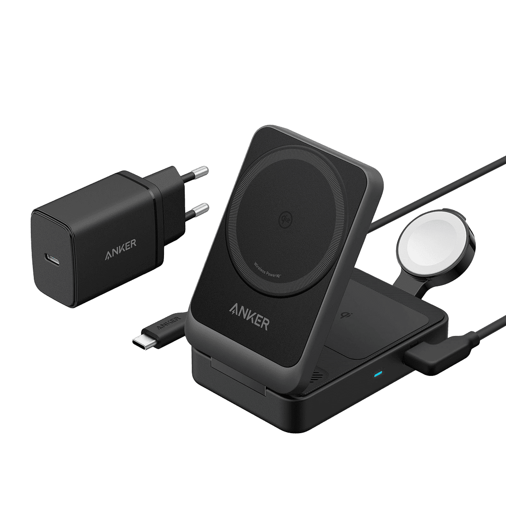 Carregador sem fios 3 em 1 Anker – Tecnologia Magsafe – Carregamento rápido: iPhone, Airpods, Apple Watch – Carregar dispositivos 3 de cada vez – Aceita o modo retrato ou paisagem – Dobrável | Preto
