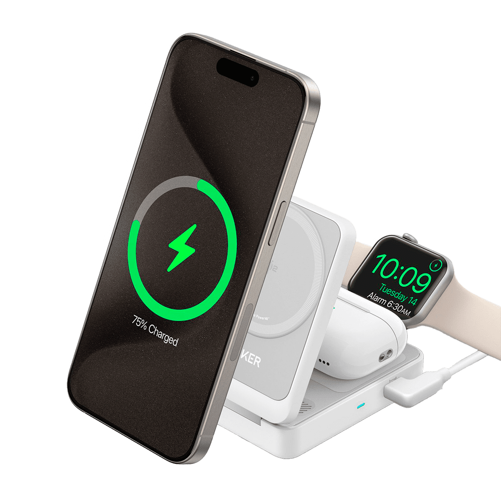 Carregador sem fios 3 em 1 Anker – Tecnologia Magsafe – Carregamento rápido: iPhone, Airpods, Apple Watch – Carregar dispositivos 3 de cada vez – Aceita o modo retrato ou paisagem – Dobrável | Branco