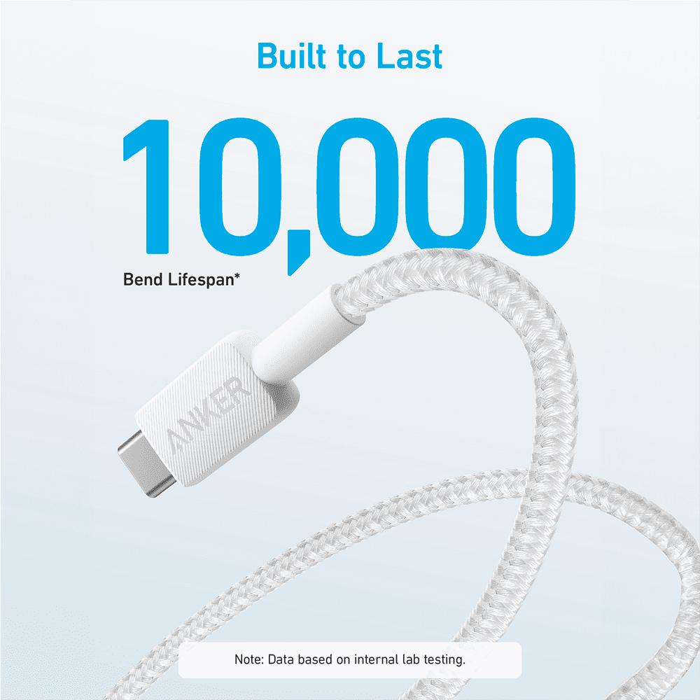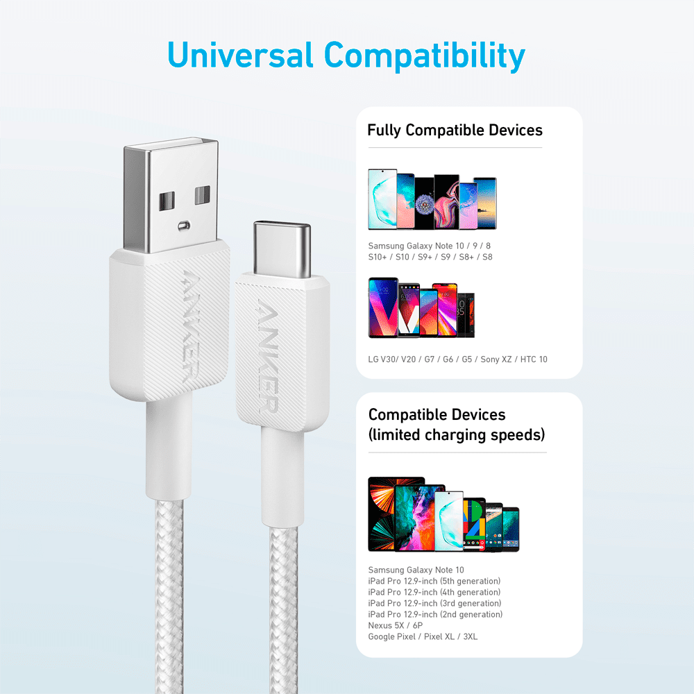 Anker – Cabo USB2.0 – USB-A para USB-C – Cabo trançado de nylon – Comprimento 0.9m – Carregamento rápido até 15W | Cor branca