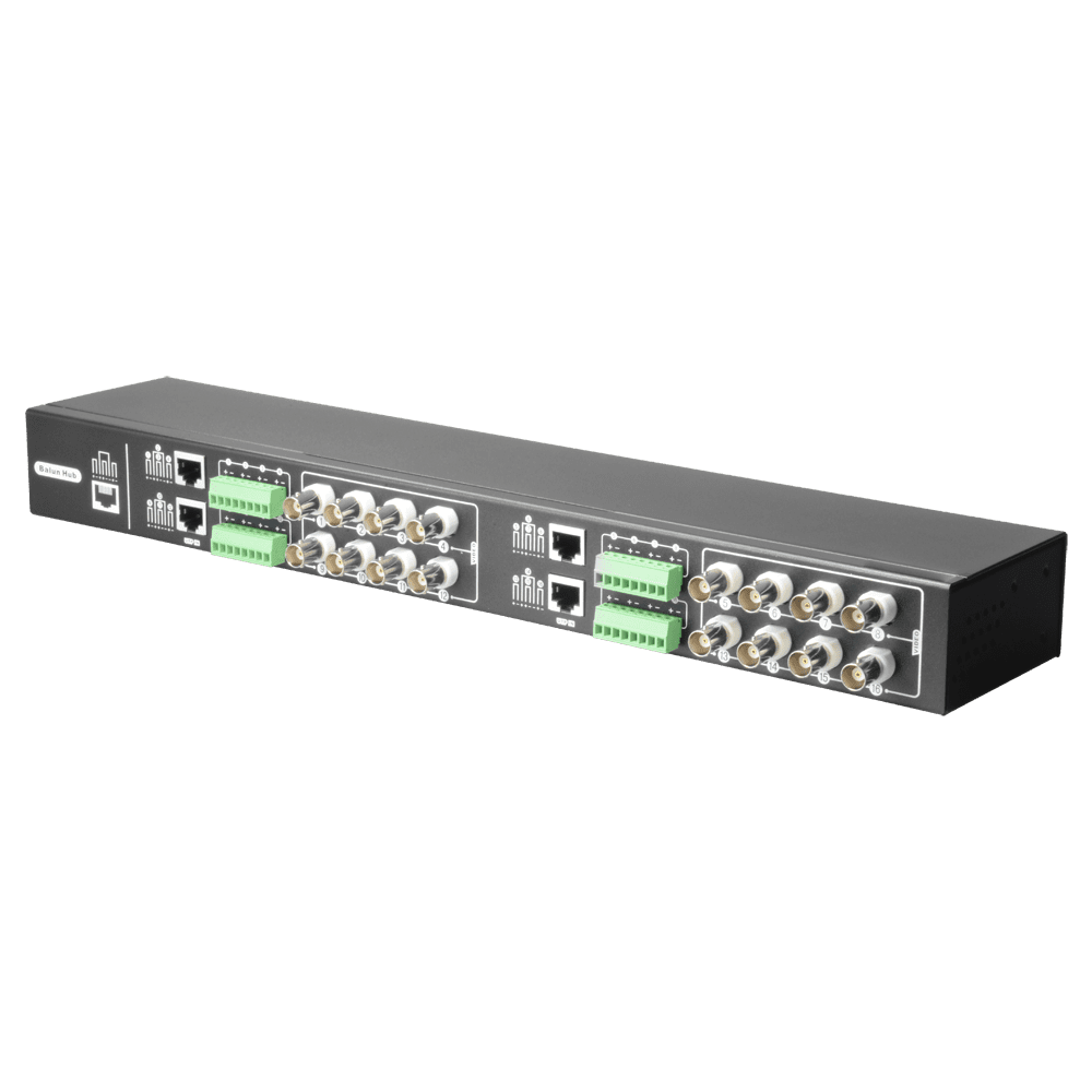 Vídeo Balun 4N1 (HDTVI, HDCVI, AHD e CVBS) – 16 canais passivos – Inclui 16 BA612P-HAC – Conexão BNC e RJ45 – Alcance: 180 ~ 440 m