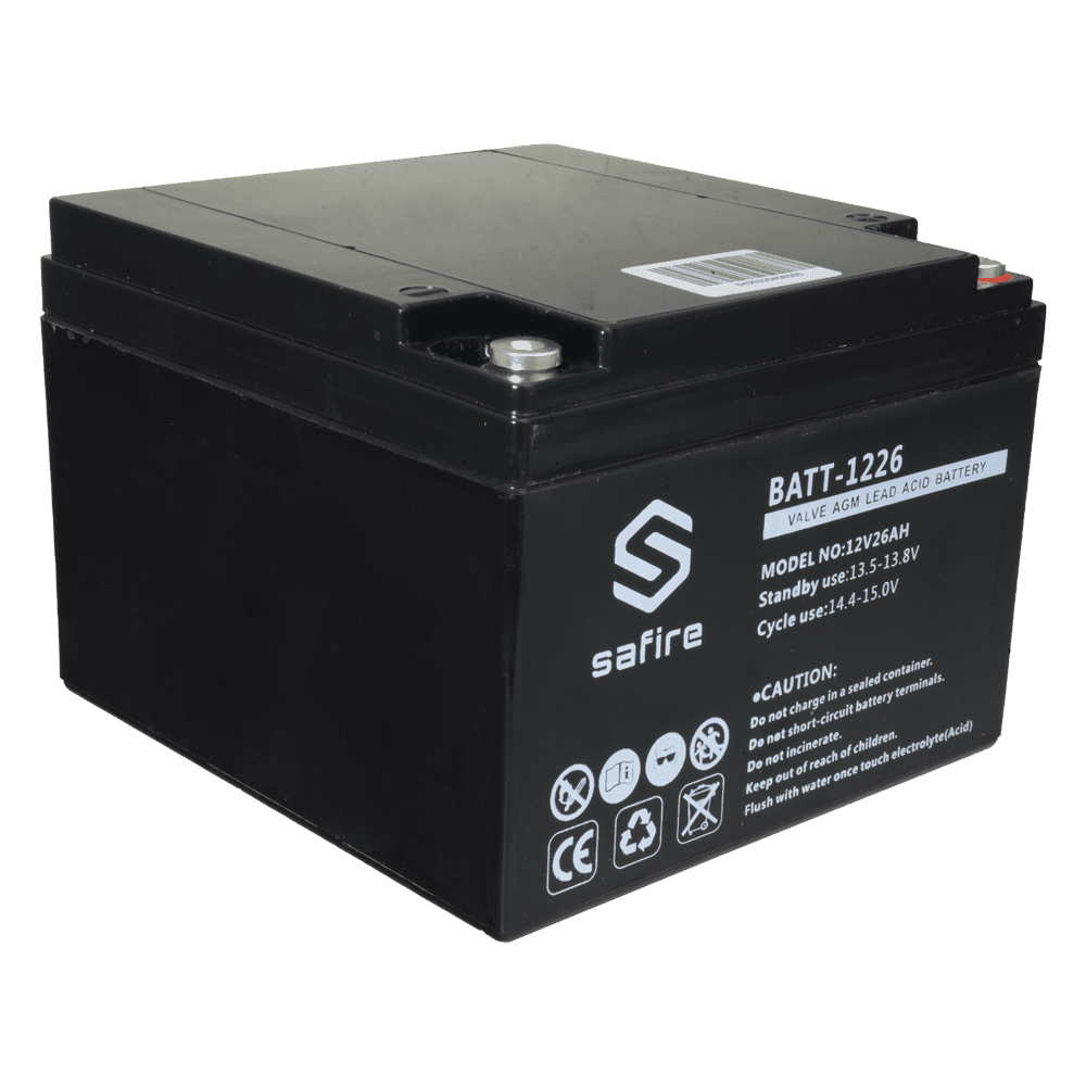 Bateria recarregável – Tecnología chumbo ácido AGM – Tensão 12 V – Capacidade 26 Ah – 182 x 166 x 126 mm / 8400 g – Para backup ou utilização directa