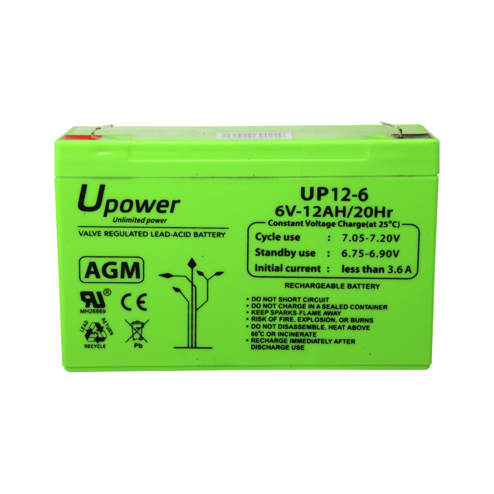 Upower – Bateria recarregável – Tecnología chumbo ácido AGM – Tensão 6 V – Capacidade 12.0 Ah – 100 x 151 x 51 / 1800 g – Para backup ou utilização directa