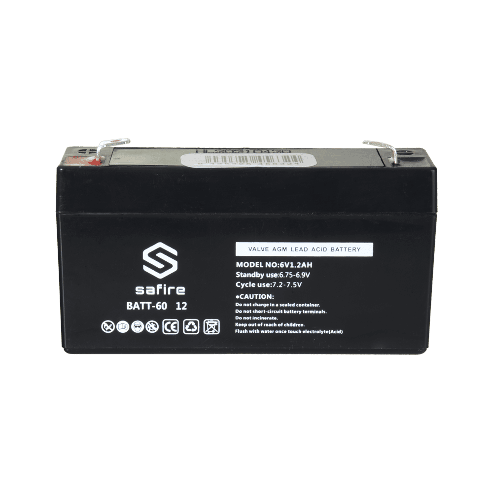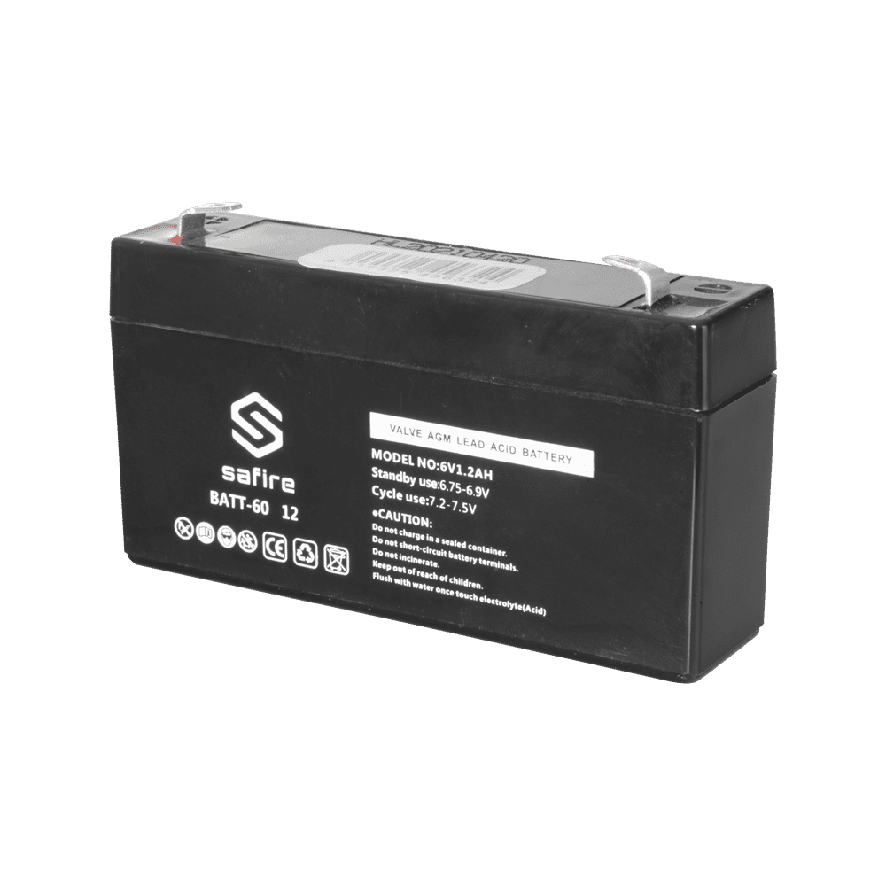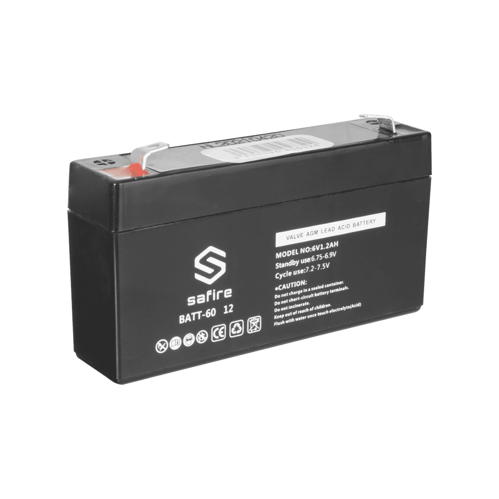 Bateria recarregável – Tecnología chumbo ácido AGM – Tensão 6 V – Capacidade 1.2 Ah – 58 x 97 x 24 mm / 290 g – Para backup ou utilização directa