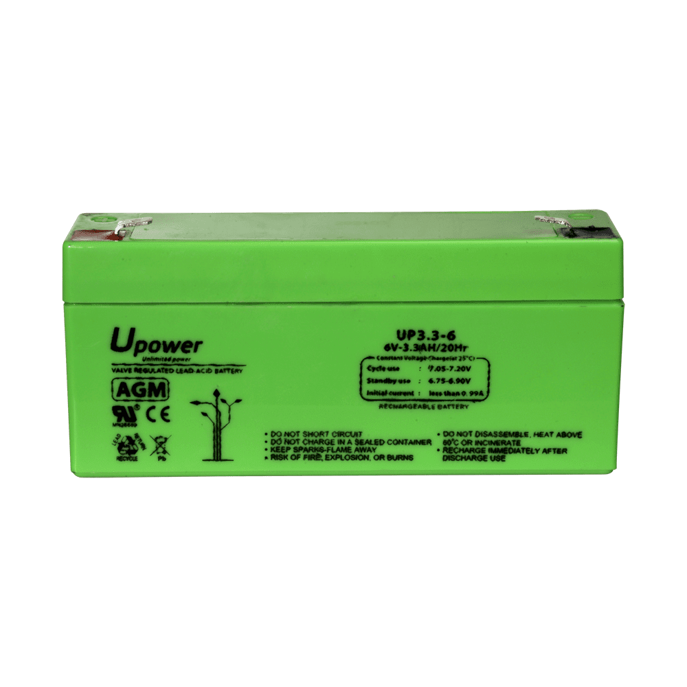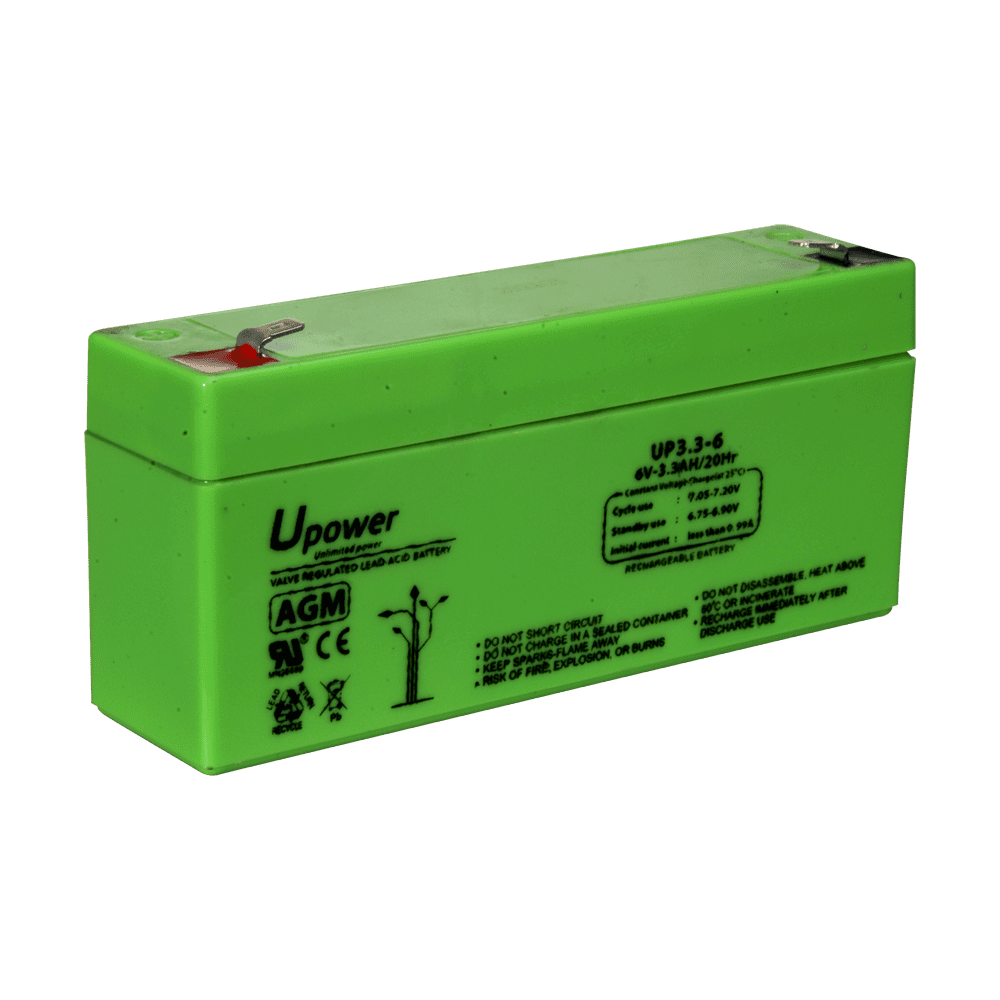 Upower – Bateria recarregável – Tecnología chumbo ácido AGM – Tensão 6 V – Capacidade 3.2 Ah – 66 x 134 x 34 / 670 g – Para backup ou utilização directa