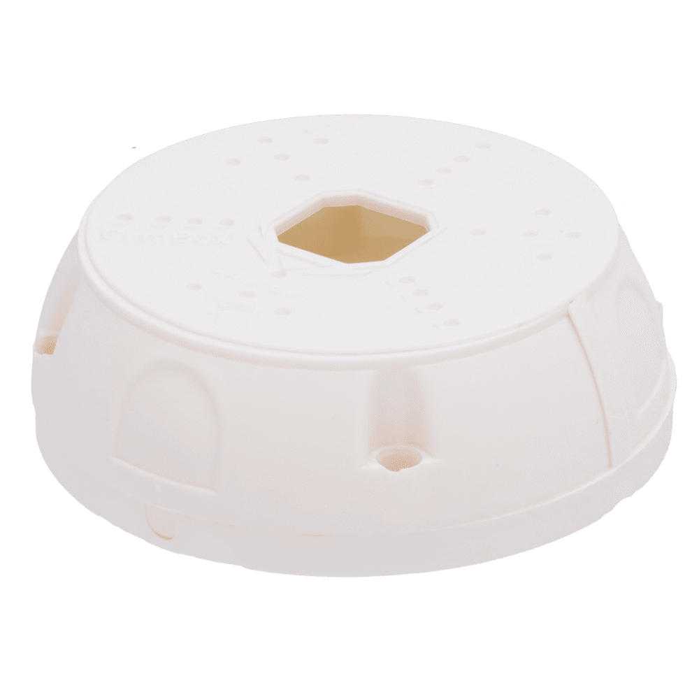 Caixa de ligação para câmaras bullet e dome – Apto para uso exterior – Instalação em tecto ou parede – Feito de plástico | Branco – Cobertura interior do cabo de acesso – Ø base 141.95 mm /  Ø zona de montaje 116.91 mm / 47.89 (Fo) mm¡ERROR! FORMATO INADECUADO
