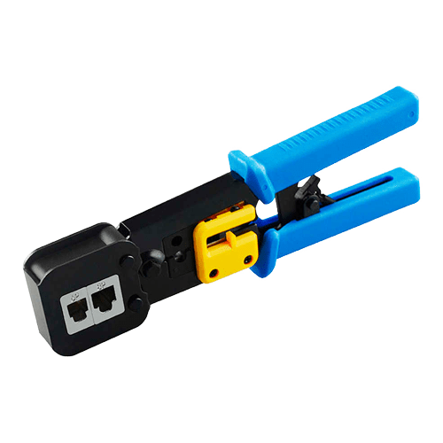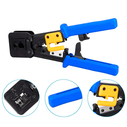 Herramienta crimpadora para conector pasante – Modelo profissional de alta qualidade – Conectores: EZ-RJ45, RJ11, RJ12 e RJ22 – Cabo: UTP – Fácil y rápido de usar – Lâmina cortadora de cabos