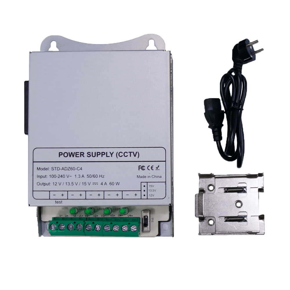 Fonte de alimentação comutada – Saída DC 12 V 5 A / 60 W – 4 saídas – Voltagem entrada 100 V ~ 240 V – 33 (Al) x 122 (Fo) x 83 (An) mm – Montagem em carril DIN