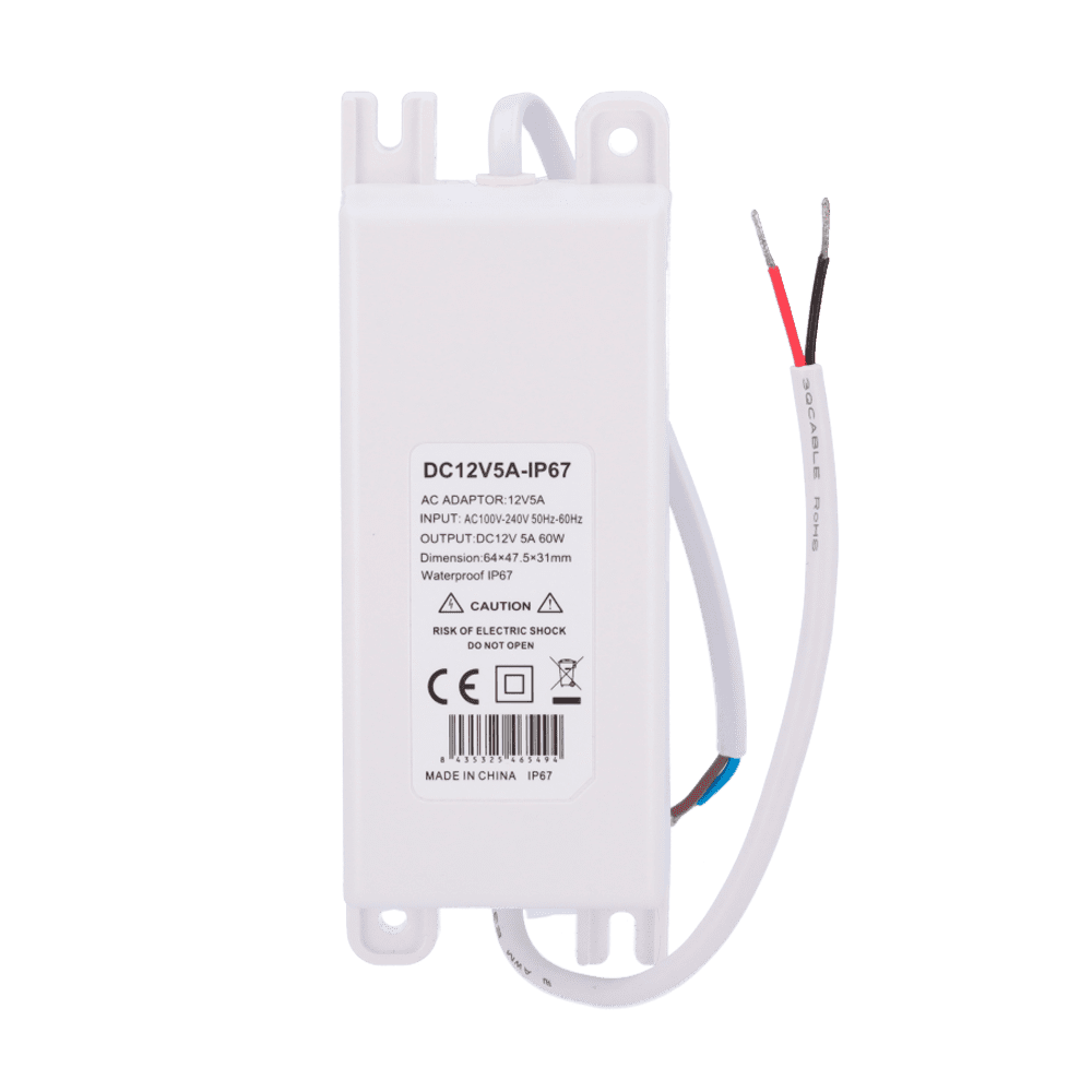Fonte de alimentação – Saída DC 12 5 A – Saída AC 230V 50Hz – Impermeável IP67 – Protecção: Sobrecarga/sobrevoltagem/sobre temperatura – Cor branco