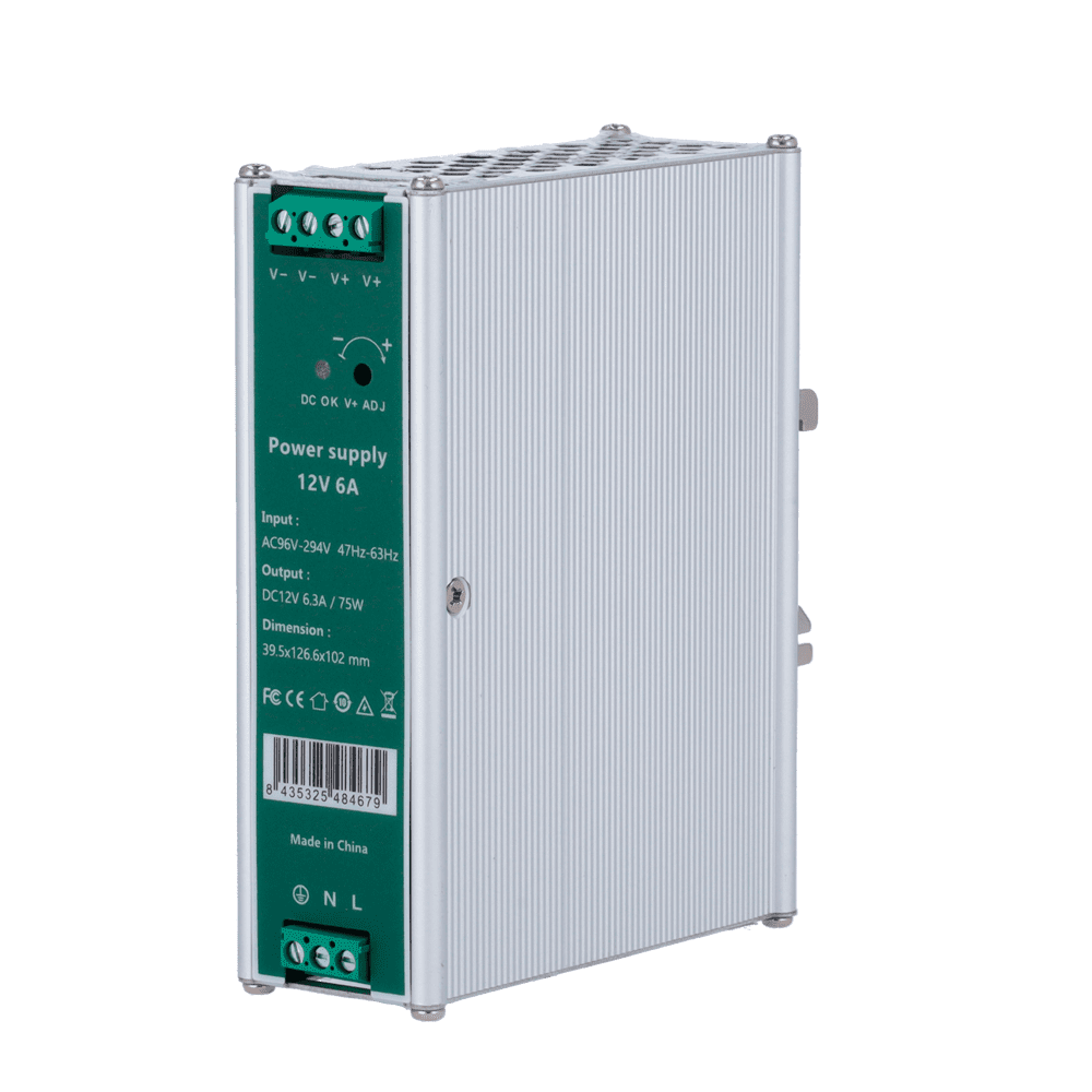 Fonte de alimentação comutada – Saída DC 12 V 6.3 A / 75 W – Tensão de entrada AC100V-240V /50Hz-60Hz [%VAR%] – 103 (Fo) x 125 (Al) x 33 (An) mm – Montagem em carril DIN – Protecção: Sobrecarga / Sobretensão / Circuito curto