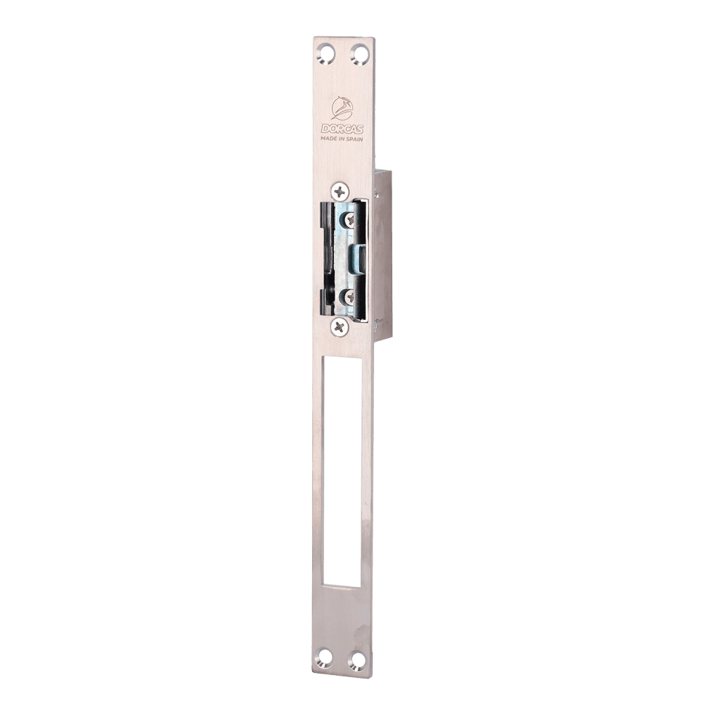 Sistema de abertura de portas eléctrico Dorcas – Para porta única : Parafuso radial ajustável – Modo abertura Fail Secure (NO) – Força de retenção 330 kg – Fonte de alimentação CA/CC 10-24V – Moldura para fechadura | Instalação sem corte