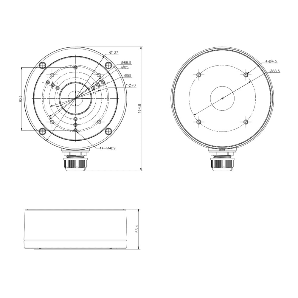 Caixa de conexões – Para câmaras dome ou bullet – Apto para uso exterior – Instalação em tecto ou parede – Passador de cabos – Cor preta 53.4 (A) x 137 (Ø) mm