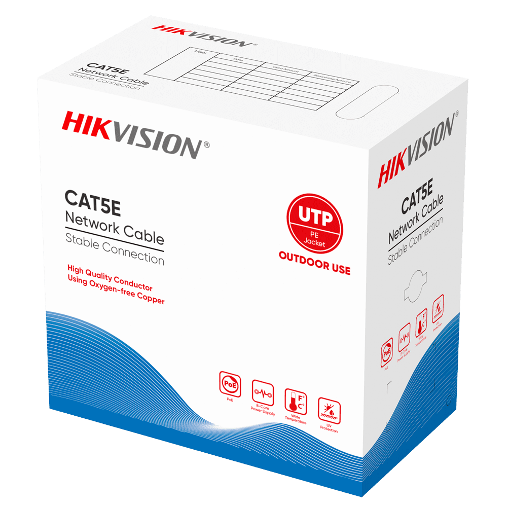 Hikvision cabo UTP categoria 5E – Condutor OFC, 99,5% cobre – Material PVC – Fornecido numa caixa de cartão de 305m. – Revestimento especial para exterior