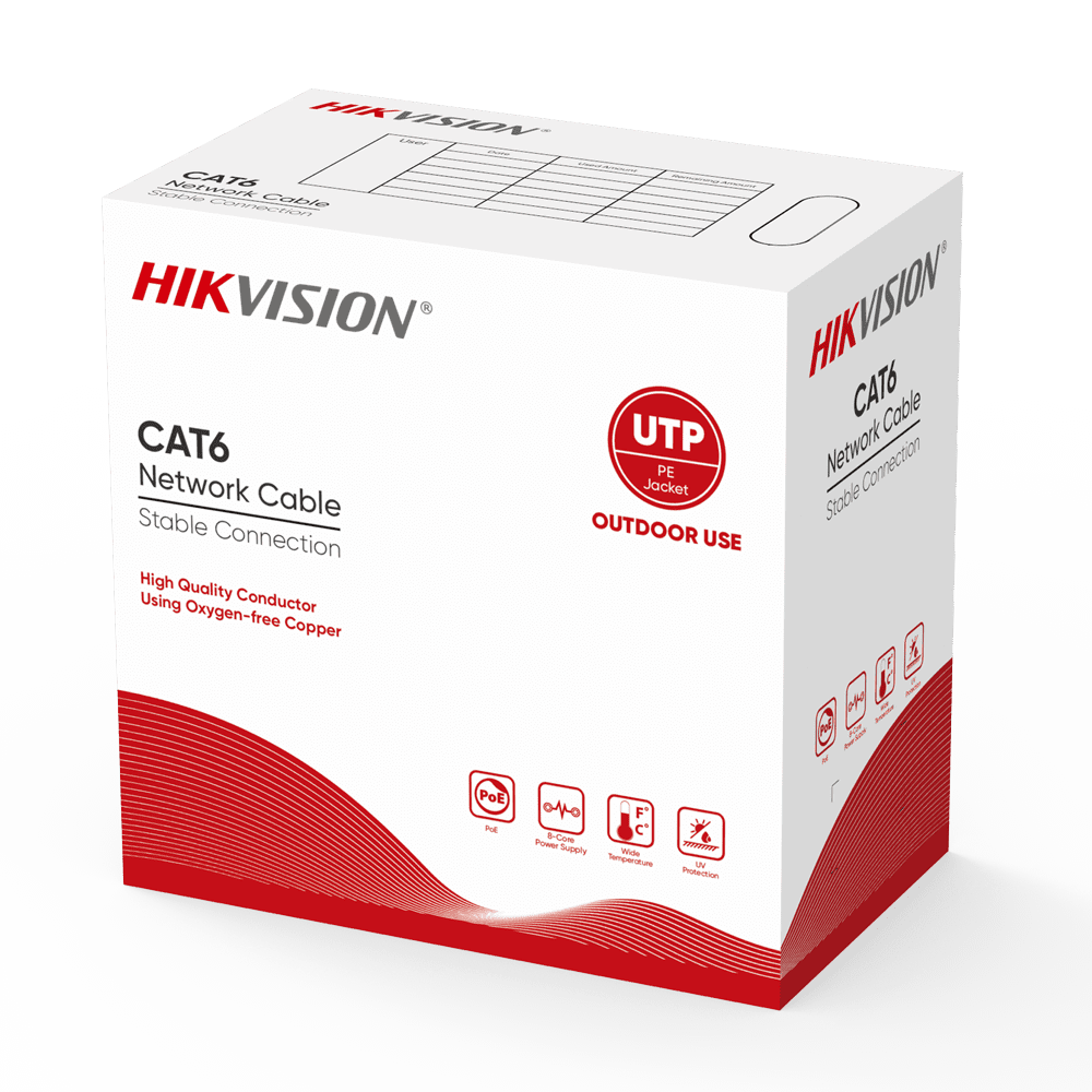 Hikvision cabo UTP categoria 6 – Condutor OFC, 99,5% cobre – Material PE – Fornecido numa caixa de cartão de 305m. – Revestimento especial para exterior