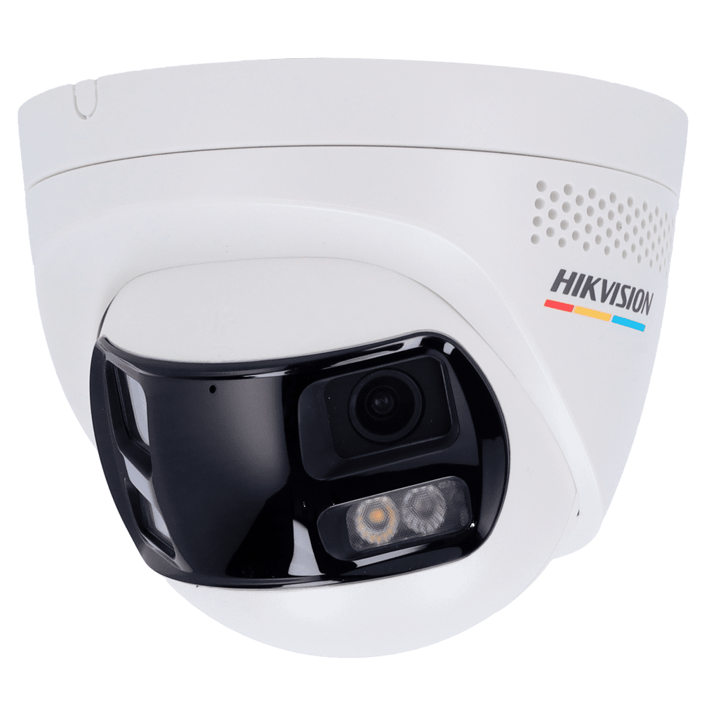 Câmara Turret IP Panorâmica Hikvision VALUE – R3solución 6 MP (3632×1632) – Luz híbrida 30 m | ColorVu – Microfone incorporado | MD 2.0 – Sirene e flash vermelho/azul dissuasor – MicroSD | Lente 2.8 mm | PoE | IP67