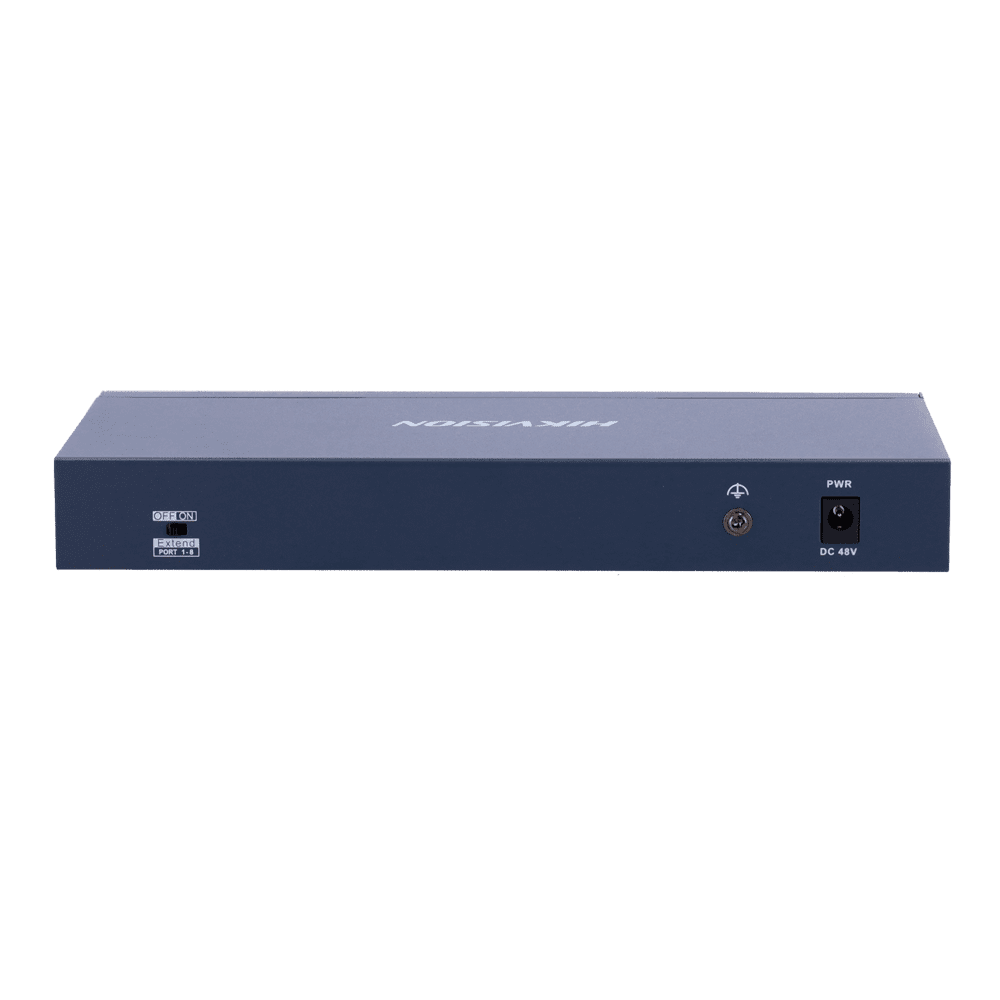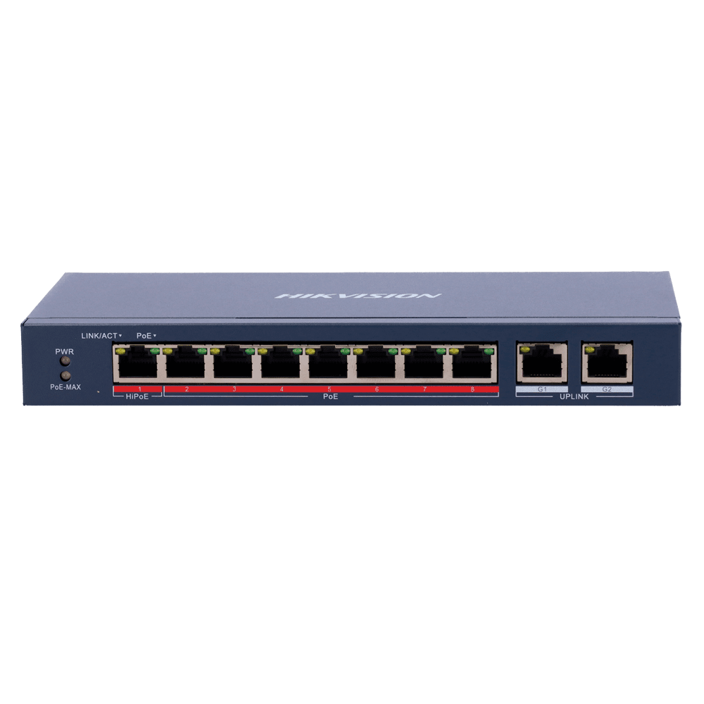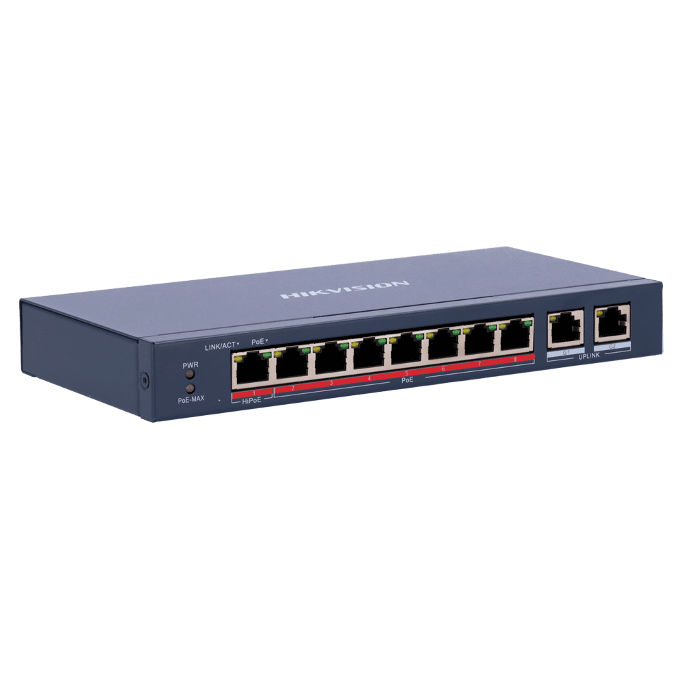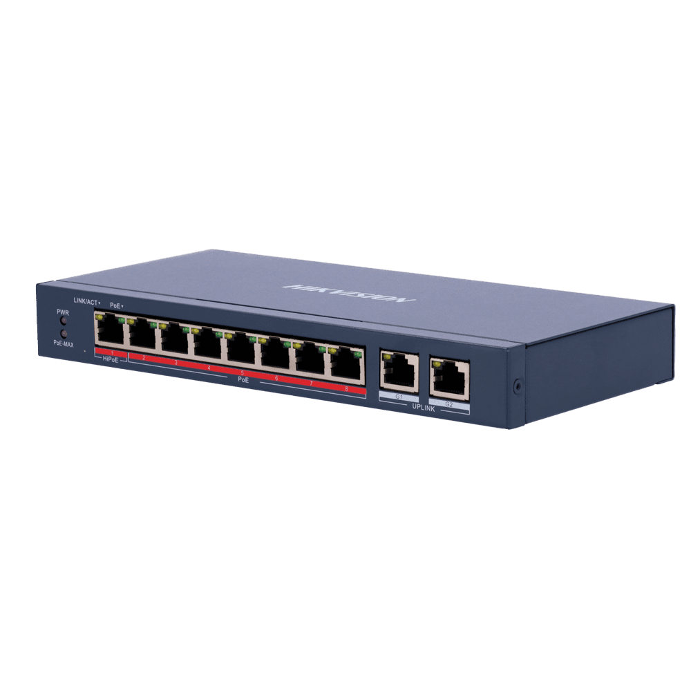 Switch PoE Hikvision – 8 portas 10/100 Mbps PoE + 2 Gigabit RJ45 – 1 Porta PoE+ 802.3af/at – Até 110W Potência PoE total – Instalação na parede ou na secretária – Gestão inteligente de PoE