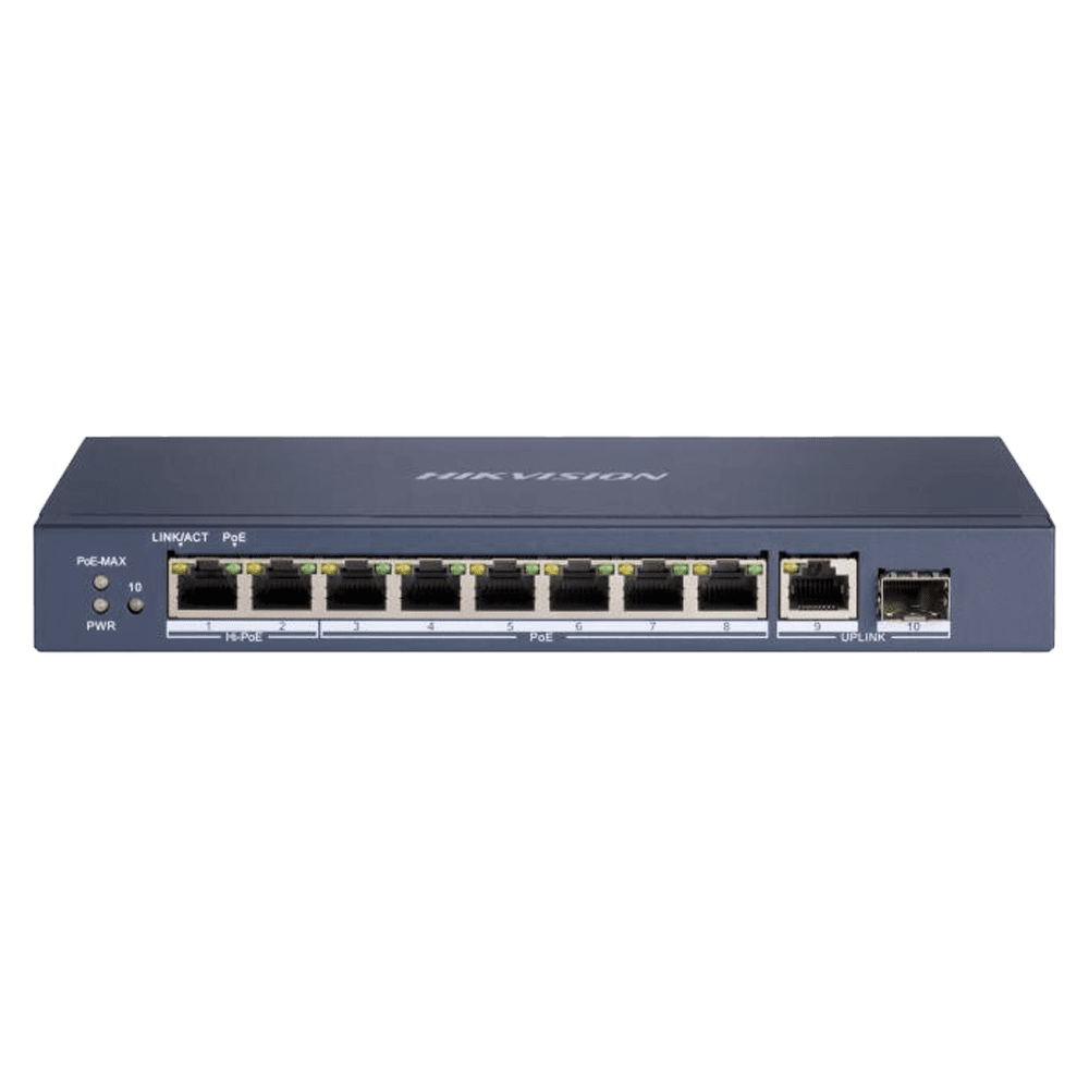Switch Hi-PoE Hikvision – 8 Portas PoE + 1 Uplink RJ45 + 1 Uplink SFP – Velocidade da porta Gigabit 10/100/1000Mbps – 6PoE+ Portas 30W + 2 Porta Hi-PoE 90W – PoE Watchdog – Até 110W Potência PoE total