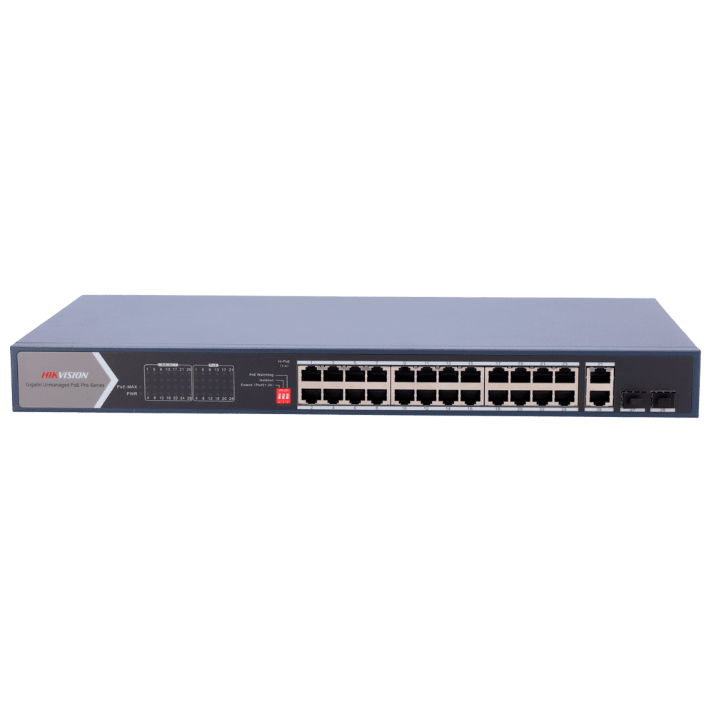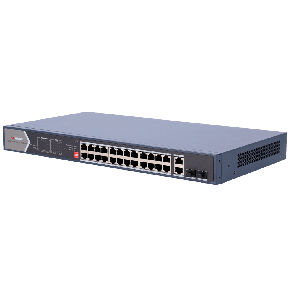 Switch PoE Hikvision – 24 RJ45 Gigabit + 4 uplink Gigabit RJ45/SFP – 20 PoE+ 802.3af/at + 4 Hi-PoE 802.3af/at/bt – Até 370w Potência PoE total – PoE Extended / PoE Watchdog / Isolamento de portas – Instalação sobre mesa