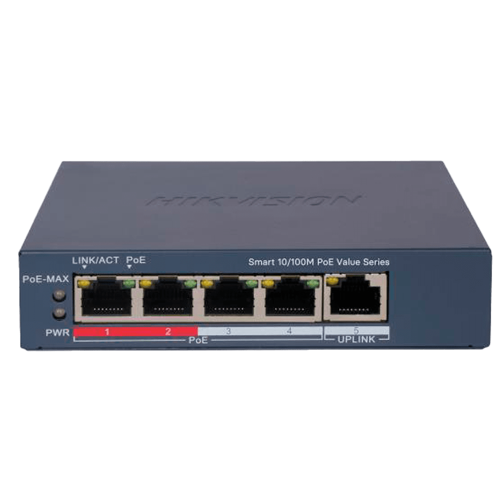 Hikvision Switch PoE Gerível – 4 portas PoE 802.3af/at + 1 Uplink RJ45 – 4 RJ45 10/100Mbps + 1 RJ45 10/100Mbps – 30W por porta 802.3af/at / Máximo 60W – VLAN/Port Isolation/Loop Detection/LLDP – Link Aggregation/PoE Watchdog/SNMP