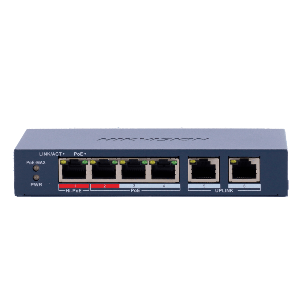 Hikvision HiPoE Switch Gerível – 4 portas PoE 802.3af/at + 2 Uplink RJ45 – 4 RJ45 10/100Mbps + 2 RJ45 10/100Mbps – 802.3af/at/bt / Máximo 60W – VLAN/Port Isolation/Loop Detection/LLDP – Link Aggregation/PoE Watchdog/SNMP