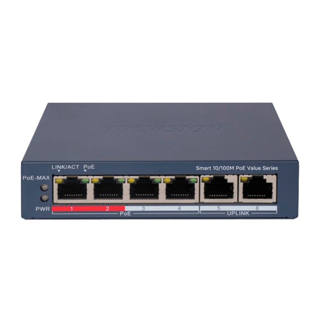 Hikvision PoE Switch Gerível – 4 portas PoE 802.3af/at + 2 Uplink RJ45 – 4 RJ45 10/100Mbps + 2 RJ45 10/100Mbps – 802.3af/at / Máximo 45W – VLAN/Port Isolation/Loop Detection/LLDP – Link Aggregation/PoE Watchdog/SNMP