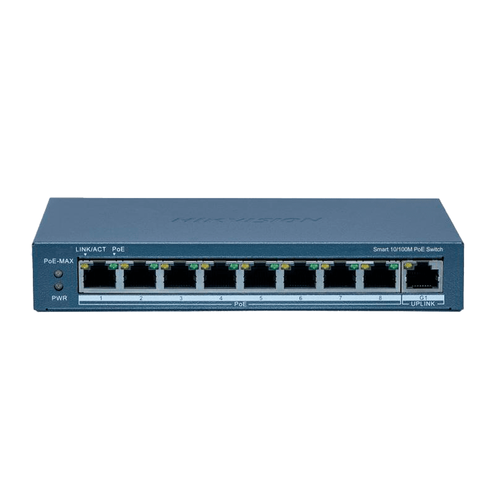 Hikvision Switch PoE Gerível – 8 portas PoE 802.3af/at + 1 Uplink RJ45 – 8 RJ45 10/100 Mbps + 1 RJ45 10/100/1000 Mbps – 30W por porta 802.3af/at / Máximo 120W – VLAN/Port Isolation/Loop Detection/LLDP – Link Aggregation/PoE Watchdog/SNMP