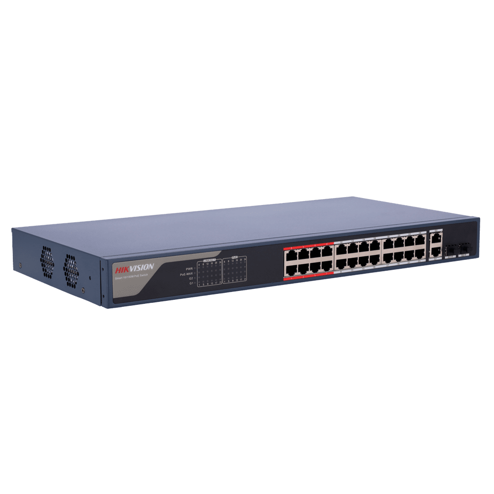 Switch PoE Hikvision – 24 portas RJ45 FE + 2 Gigabit RJ45/SFP portas [%VAR%] – 24 Portas PoE+ 802.3af/at – Até 370w Potência PoE total – PoE Extended / PoE Watchdog / Isolamento de portas – Instalação em rack/parede/desktop