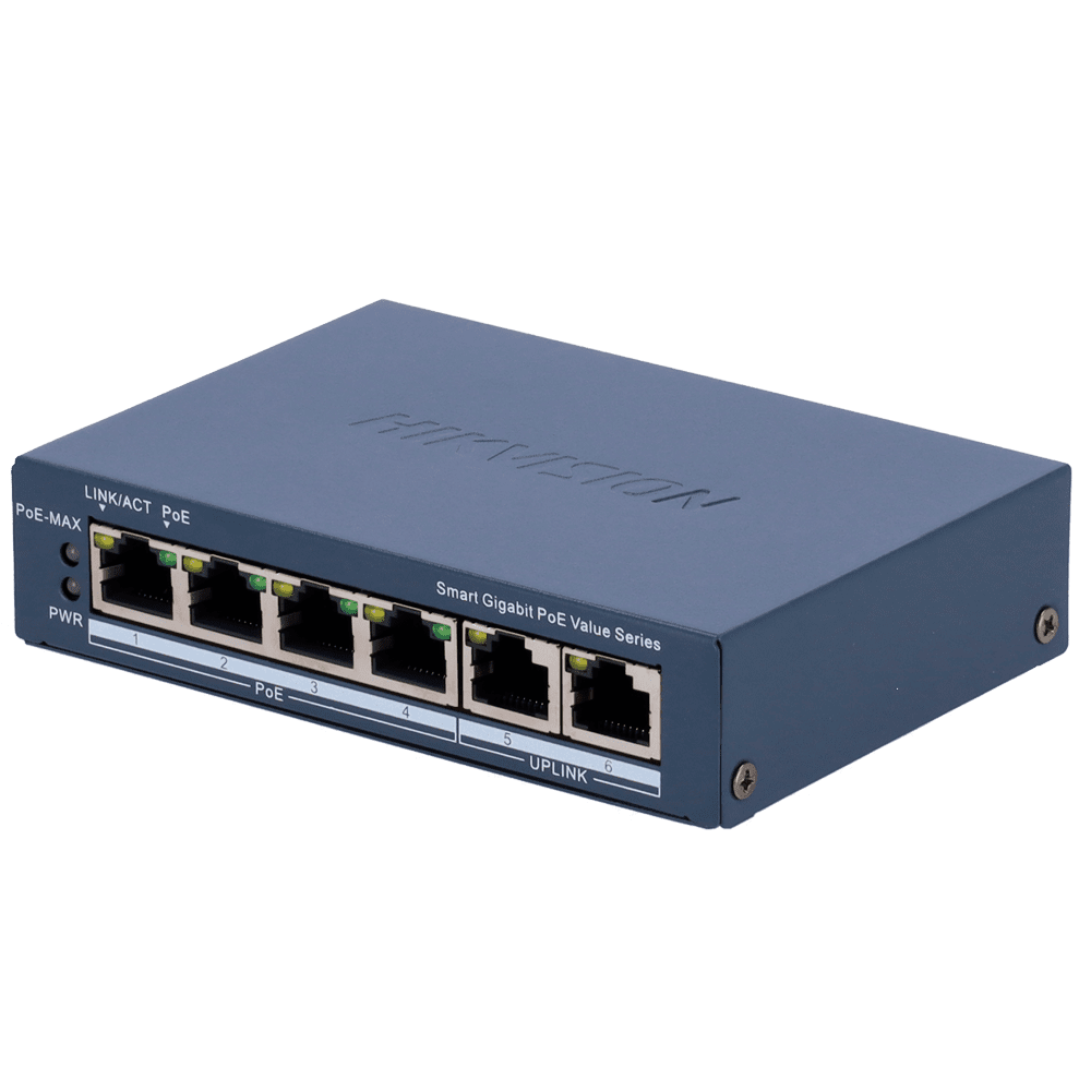 Hikvision Gigabit PoE Switch Gerível – 4 portas PoE 802.3af/at + 2 Uplink RJ45 – 4 RJ45 10/100/1000 Mbps + 2 RJ45 10/100/1000Mbps – 802.3af/at / Máximo 45W – VLAN/Port Isolation/Loop Detection/LLDP – Link Aggregation/PoE Watchdog/SNMP