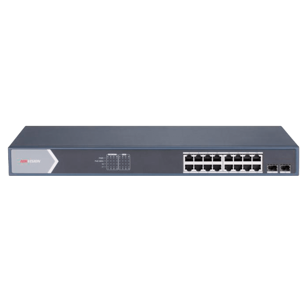 Switch PoE Hikvision – 16 portas RJ45 GE + 2 portas Gigabit SFP – 16 Portas PoE+ 802.3af/at – Até 225w Potência PoE total – PoE Extended / PoE Watchdog / Isolamento de portas – Instalação em rack/parede/desktop