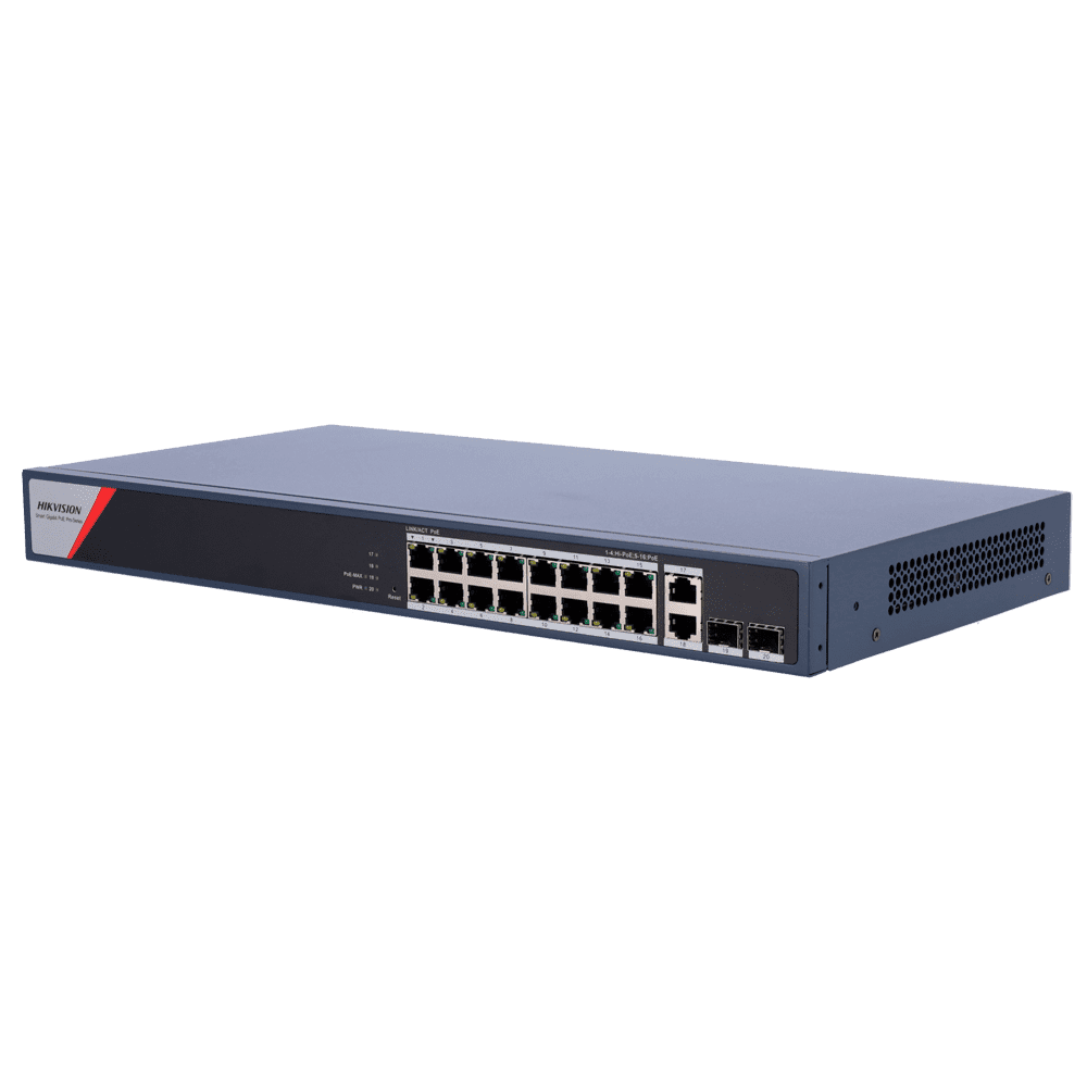 Switch PoE Hikvision – 16 portas RJ45 GE + 2 Gigabit RJ45/SFP portas [%VAR%] – 16 Portas PoE+ 802.3af/at/bt – Até 230w Potência PoE total – PoE Extended / PoE Watchdog / Isolamento de portas – Instalação em rack/parede/desktop