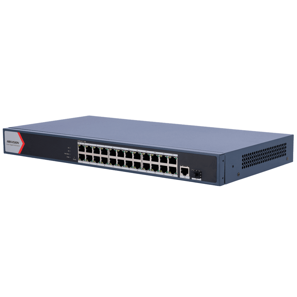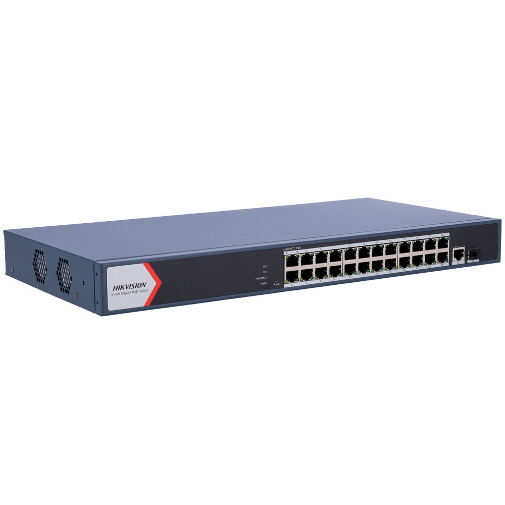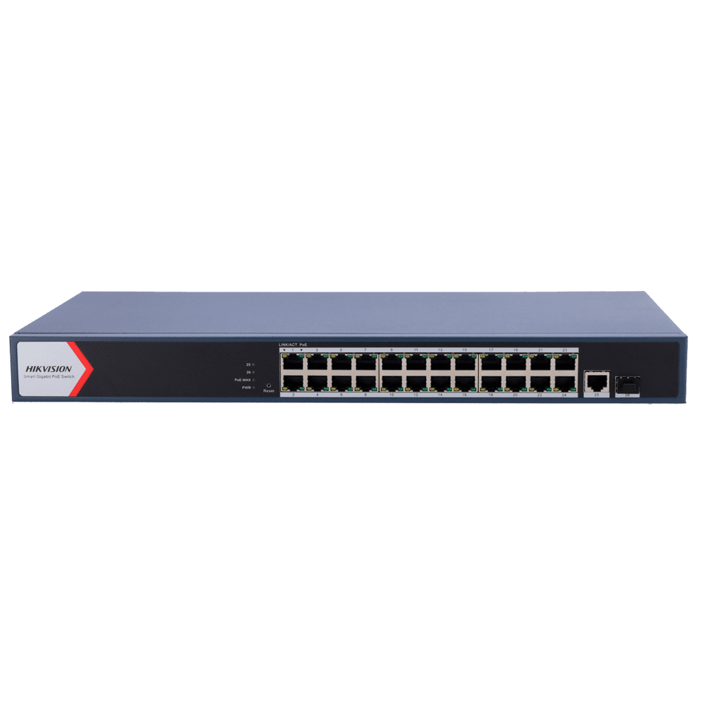Switch PoE Hikvision – 24 portas RJ45 GE + 1 porta Gigabit RJ45/SFP – 24 Portas PoE+ 802.3af/at – Até 370w Potência PoE total – PoE Extended / PoE Watchdog / Isolamento de portas – Instalação em rack/parede/desktop