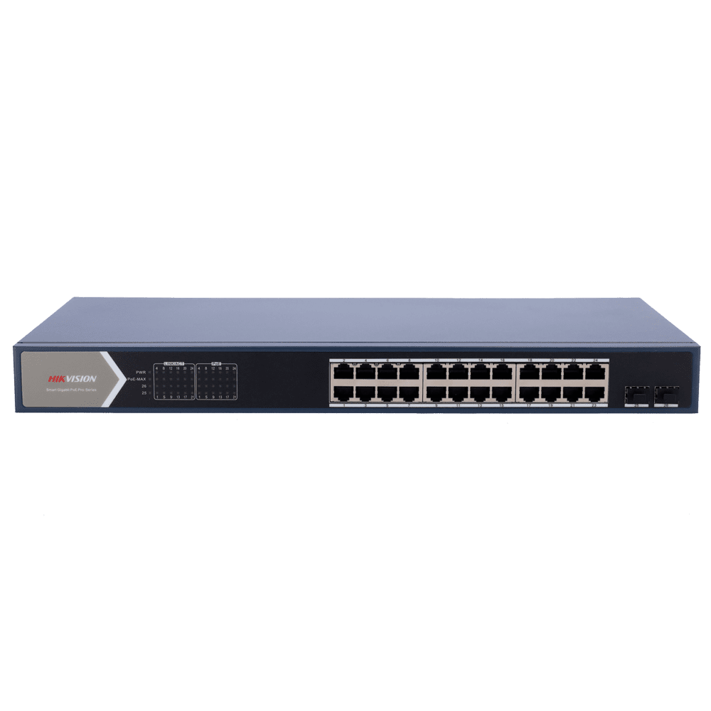 Switch PoE Hikvision – 24 portas RJ45 GE + 2 portas Gigabit SFP – 24 Portas PoE+ 802.3af/at – Até 370w Potência PoE total – PoE Extended / PoE Watchdog / Isolamento de portas – Instalação em rack/parede/desktop