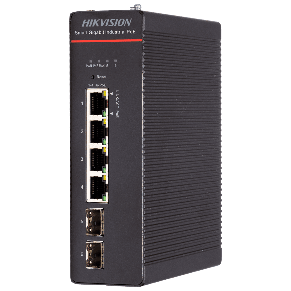 Hikvision Switch Industrial PoE Cloud Capa 2 – 4 portas Gigabit PoE++ + 2 portas SFP Gigabit – Compatível 802.3af/at/bt / Máximo 300W – Static LAG/DHCP Snoop/IGMP Snoop/Port Mirror – Prevenção de VLAN/Loop/STP/RSTP/ACL/Watchdog – Montagem em carril DIN