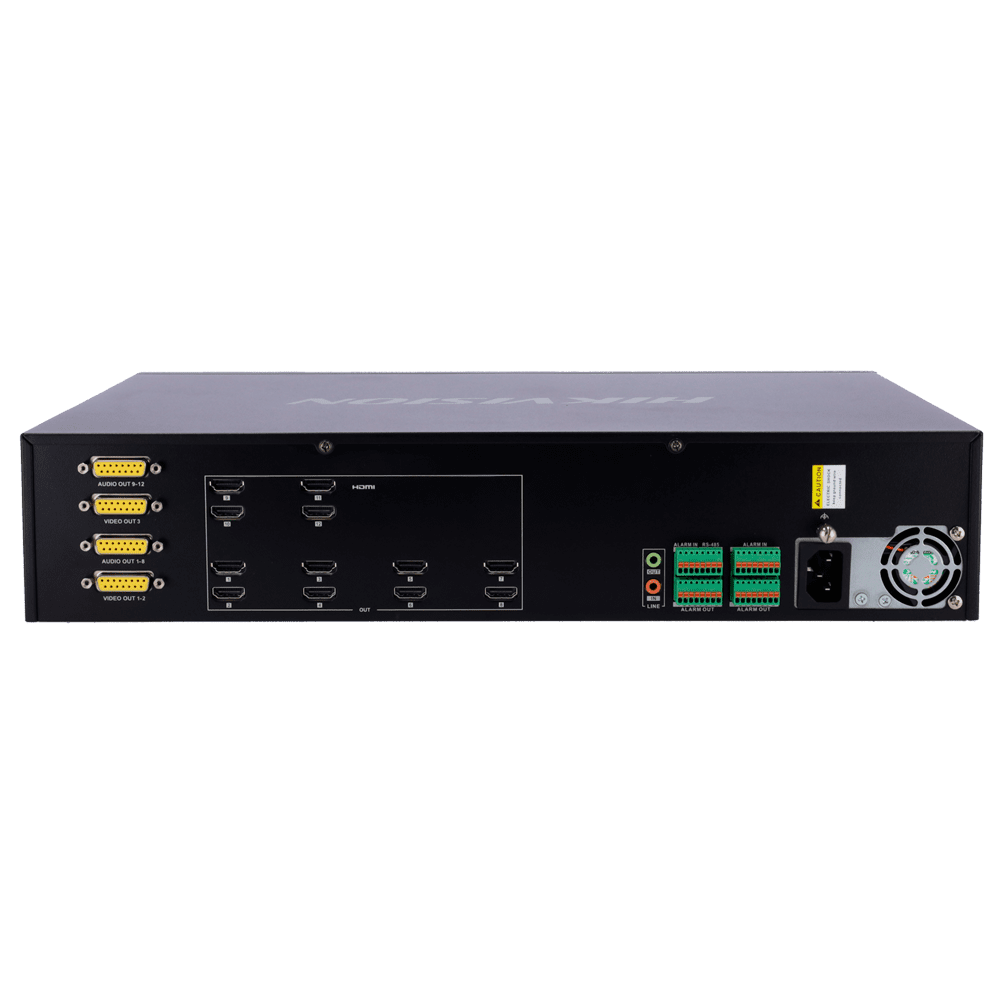 Descodificador Hikvision – 192 canais – Capacidade de descodificação até 32 MPx – 12 saídas HDMI 4K | 3 saídas DB15 a BNC – Alarmes | Áudio – Compatível com ONVIF