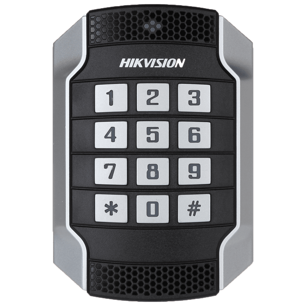 Leitor de acesso – Acesso por cartão MF e PIN – Indicador LED e acústico – Wiegand 26/34 | RS485 – Compatível com os controladores Hikvision – Adequado para uso exterior IP65 | IK10