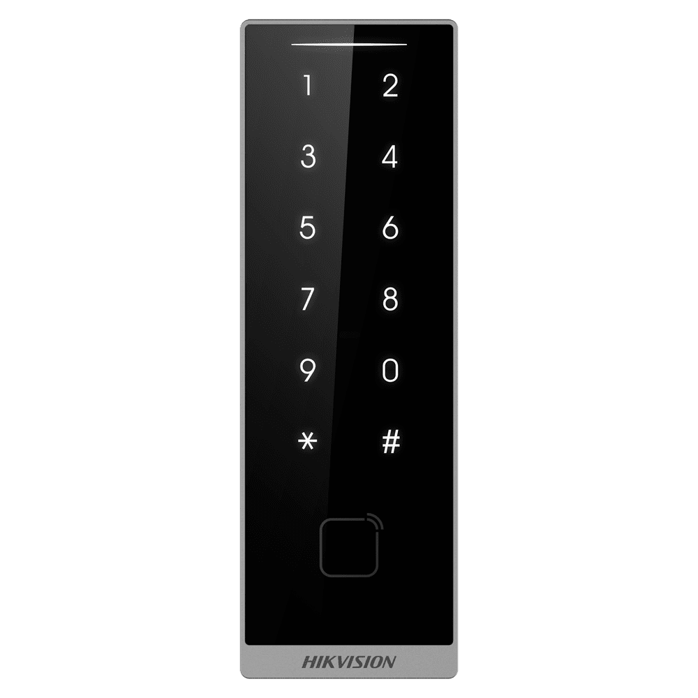 Leitor de acesso para armações – Acesso por cartão EM/MF e PIN – Indicador LED e acústico – Wiegand 26/34 | RS485 – Compatível com os controladores Hikvision – Apto para exterior IP66