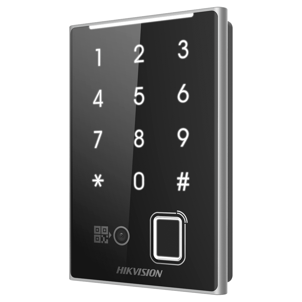 Leitor de acesso – Acesso por impressão digital, cartão MF DESFire, código QR e PIN – Indicador LED e acústico – Wiegand 26/34 | RS485 – Compatível com os controladores Hikvision – Apto para exterior IP65