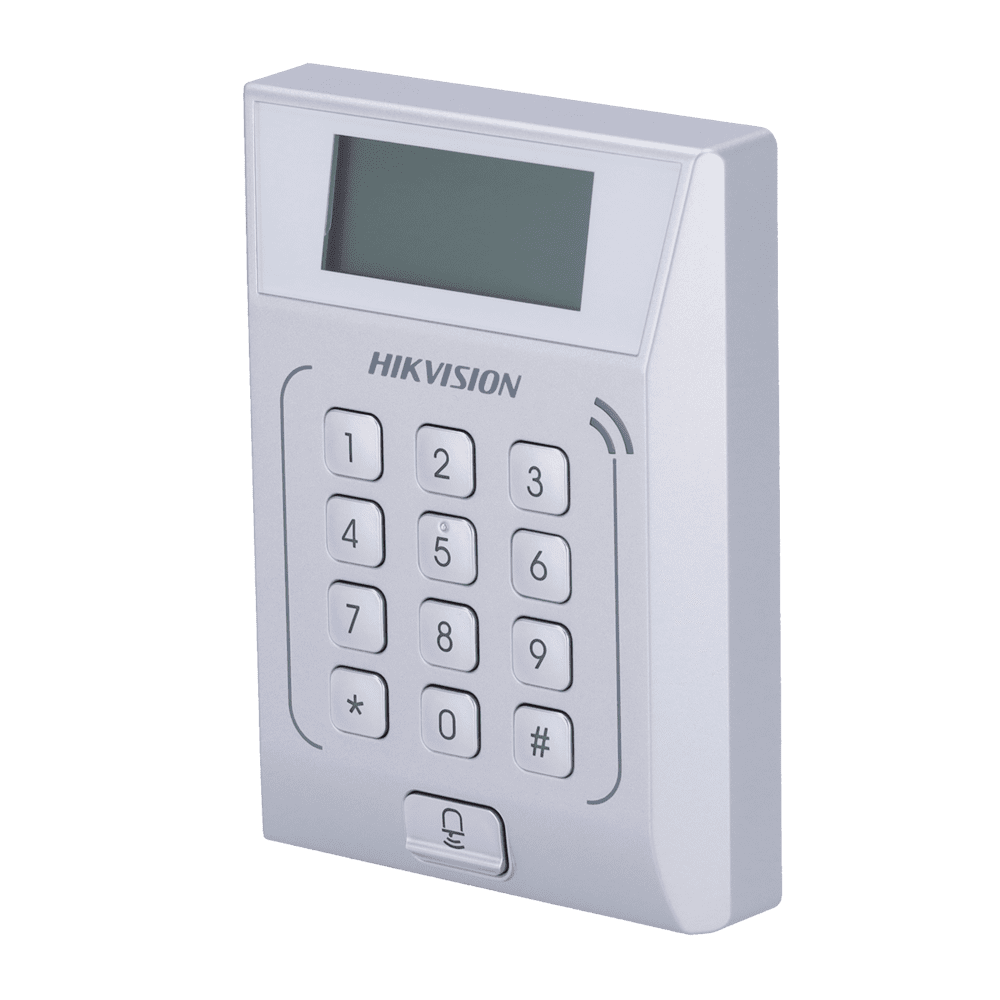 Controlo de acesso – Cartão EM e PIN – 3.000 utilizadores | 10.000 registos – TCP/IP – 128 x 64 LCD | Controlador integrado – Software iVMS-4200