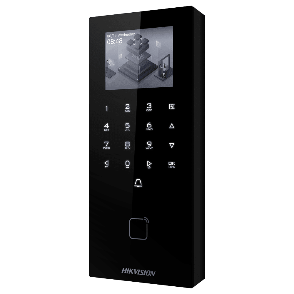 Controlo de acesso e presença PoE IP65 – Cartão MF e PIN – 5.000 utilizadores | 150.000 registos – TCP/IP, USB, RS485 e Wiegand – 2.4″ TFT | Controlador integrado – iVMS-4200 | Hik-Connect