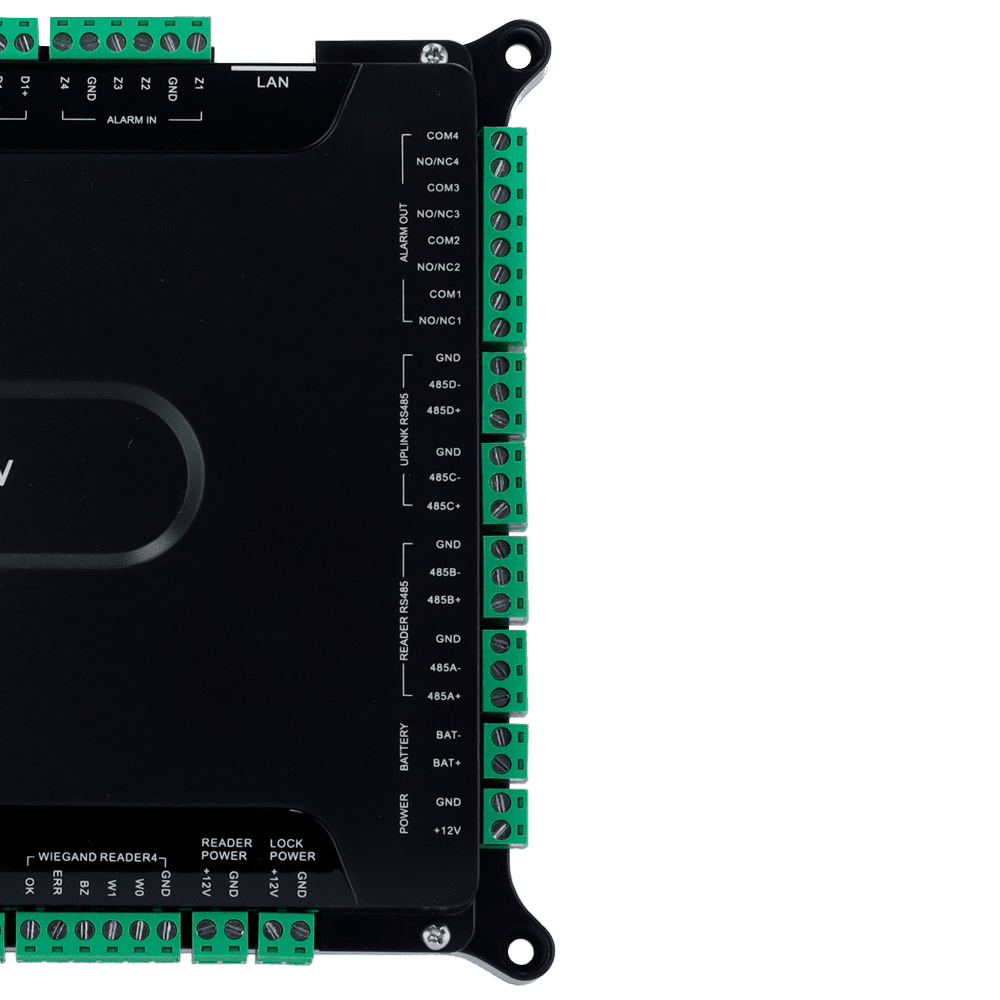 | Entradas | 4 x Wiegand 26/34, 2 x RS485/OSDP,>44 x sensor de porta 8 x botão de abertura, 4 x auxiliar, 1 x entrada de alarme, [%VAR%] x tamper |